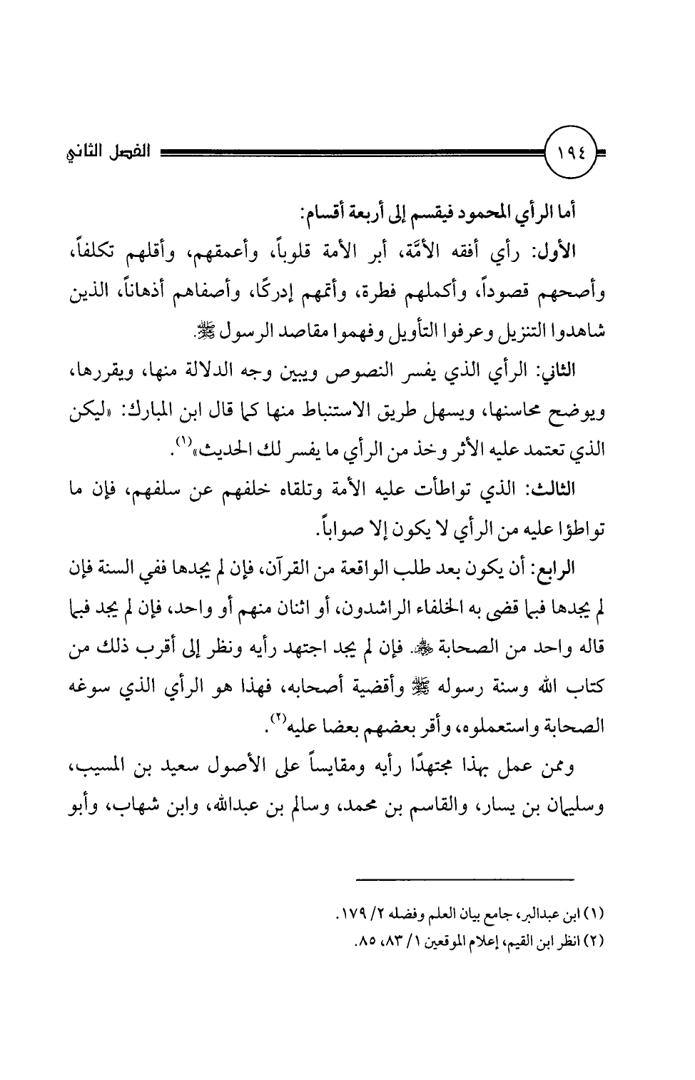 الأول: رأي افقه الأمه، ابر الأمة قلوبا، وأعمقهم، وأقلهم تكلفا،