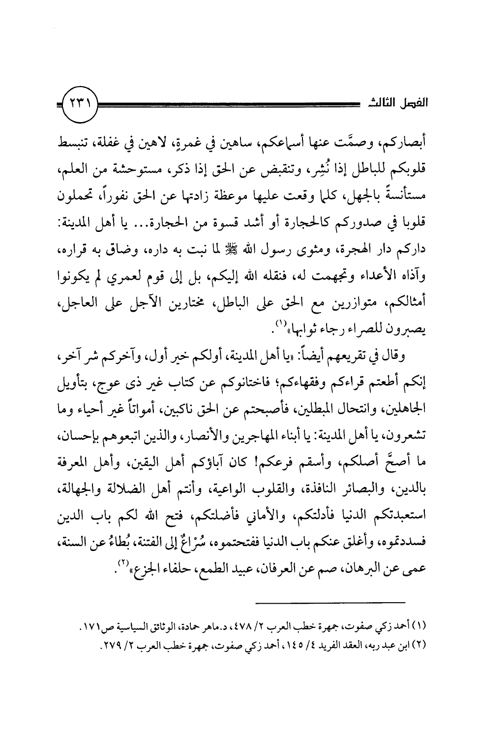 (1) أحمد زكي صفوت، جمهرة خطب العرب 2/ 478، د. ماهر حمادة، الوثائق السياسية ص 1 17.