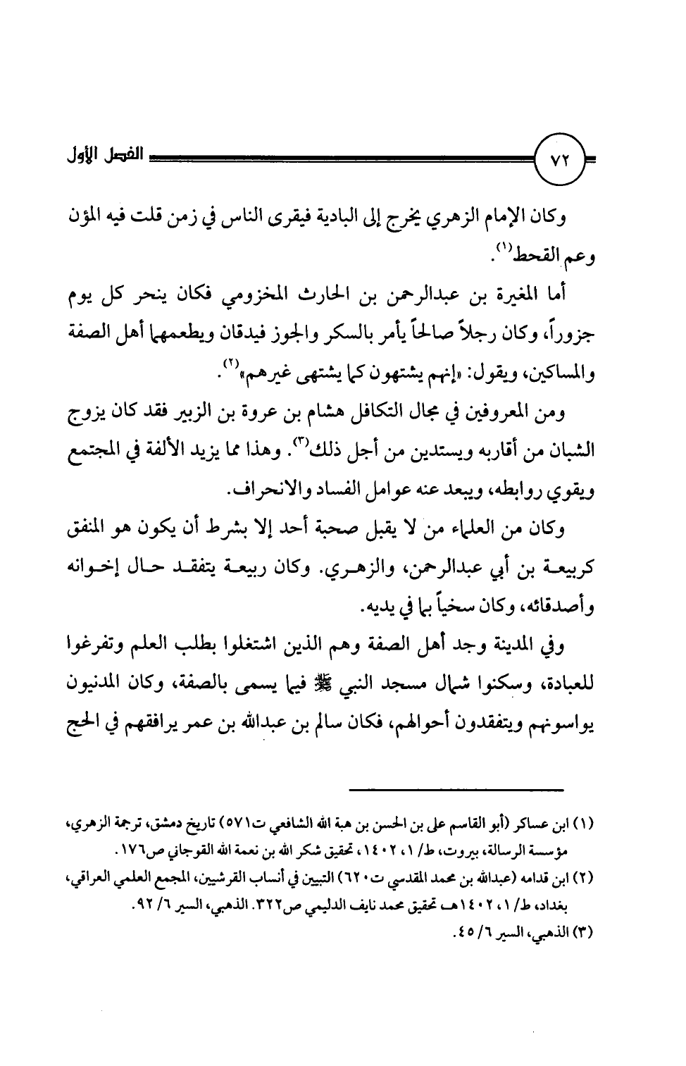وكان الإمام الزهري يخرج إلى البادية فيقرى الناس في زمن قلت فيه المؤن