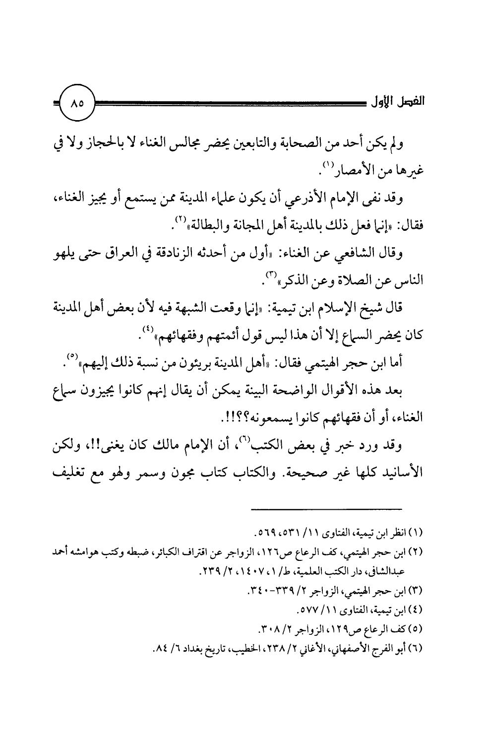 ولم يكن احد من الصحابة والتابعين يحضر مجالس الغناء لا بالحجاز ولا في
