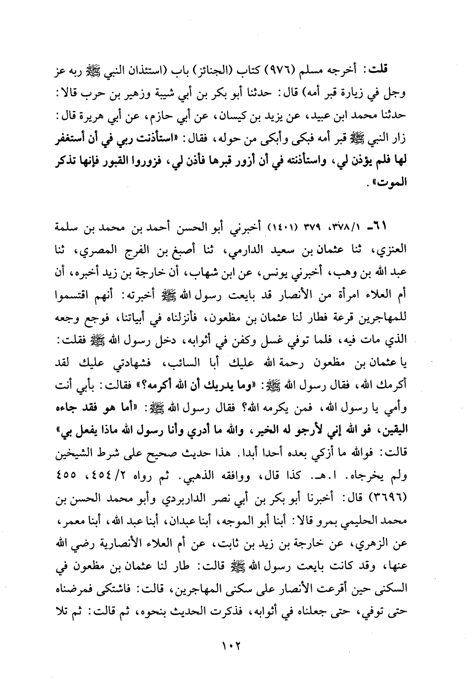 61 - 1/ 378، 379 (1401) أخبرني أبو الحسن أحمد بن محمد بن سلمة العنزي، ثنا عثمان بن سعيد الدارمي، ثنا أصبغ بن الفرج المصري، ثنا عبد الله بن وهب، أخبرني يونس، عن ابن شهاب، أن خارجة بن زيد أخبره، أن أم العلاء امرأة من الأنصار قد بايعت رسول الله - صلى الله عليه وسلم - أخبرته: أنهم اقتسموا للمهاجرين قرعة فطار لنا عثمان بن مظعون، فأنزلناه في أبياتنا، فوجع وجعه الذي مات فيه، فلما توفي غسل وكفن في أثوابه، دخل رسول الله - صلى الله عليه وسلم - فقلت: يا عثمان بن مظعون رحمة الله عليك أبا السائب، فشهادتي عليك لقد أكرمك الله، فقال رسول الله - صلى الله عليه وسلم -: "وما يدريك أن الله أكرمه؟ " فقالت: بأبي أنت وأمي يا رسول الله، فمن يكرمه الله؟ فقال رسول الله - صلى الله عليه وسلم -: "أما هو فقد جاءه اليقين، فوالله إني لأرجو له الخير، والله ما أدري وأنا رسول الله ماذا يفعل بي" قالت: فوالله ما أزكي بعده أحدا أبدا. هذا حديث صحيح على شرط الشيخين ولم يخرجاه. ا. هـ. كذا قال، ووافقه الذهبي. ثم رواه 2/ 454، 455 (3696) قال: أخبرنا أبو بكر بن أبي نصر الداربردي وأبو محمد الحسن بن محمد الحليمي بمرو قالا: أبنا أبو الموجه، أبنا عبدان، أبنا عبد الله، أبنا معمر، عن الزهري، عن خارجة بن زيد بن ثابت، عن أم العلاء الأنصارية رضي الله عنها، وقد كانت بايعت رسول الله - صلى الله عليه وسلم - قالت: طار لنا عثمان بن مظعون في السكنى حين أقرعت الأنصار على سكنى المهاجرين، قالت: فاشتكى فمرضناه حتى توفي، حتى جعلناه في أثوابه، فذكرت الحديث بنحوه، ثم قالت: ثم تلا