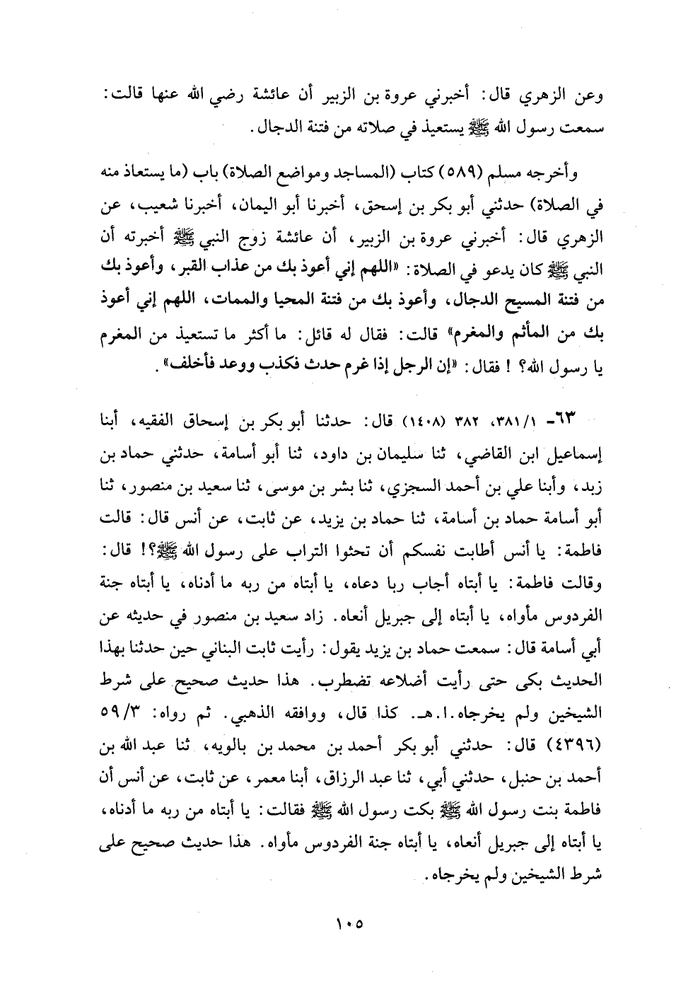 63 - 1/ 381، 382 (1408) قال: حدثنا أبو بكر بن إسحاق الفقيه، أبنا إسماعيل ابن القاضي، ثنا سليمان بن داود، ثنا أبو أسامة، حدثني حماد بن زبد، وأبنا علي بن أحمد السجزي، ثنا بشر بن موسى، ثنا سعيد بن منصور، ثنا أبو أسامة حماد بن أسامة، ثنا حماد بن يزيد، عن ثابت، عن أنس قال: قالت فاطمة: يا أنس أطابت نفسكم أن تحثوا التراب على رسول الله - صلى الله عليه وسلم -؟! قال: وقالت فاطمة: يا أبتاه أجاب ربا دعاه، يا أبتاه من ربه ما أدناه، يا أبتاه جنة الفردوس مأواه، يا أبتاه إلى جبريل أنعاه. زاد سعيد بن منصور في حديثه عن أبي أسامة قال: سمعت حماد بن يزيد يقول: رأيت ثابت البناني حين حدثنا بهذا الحديث بكى حتى رأيت أضلاعه تضطرب. هذا حديث صحيح على شرط الشيخين ولم يخرجاه. ا. هـ. كذا قال، ووافقه الذهبي. ثم رواه: 3/ 59 (4396) قال: حدثني أبو بكر أحمد بن محمد بن بالويه، ثنا عبد الله بن أحمد بن حنبل، حدثني أبي، ثنا عبد الرزاق، أبنا معمر، عن ثابت، عن أنس أن فاطمة بنت رسول الله - صلى الله عليه وسلم - بكت رسول الله - صلى الله عليه وسلم - فقالت: يا أبتاه من ربه ما أدناه، يا أبتاه إلى جبريل أنعاه، يا أبتاه جنة الفردوس مأواه. هذا حديث صحيح على شرط الشيخين ولم يخرجاه.