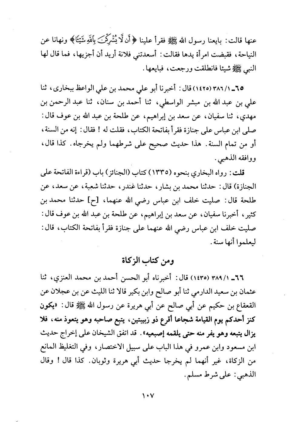 66 - 1/ 389 (1435) قال: أخبرناه أبو الحسن أحمد بن محمد العنزي، ثنا عثمان بن سعيد الدارمي ثنا أبو صالح وابن بكير قالا ثنا الليث عن بن عجلان عن القعقاع بن حكيم عن أبي صالح عن أبي هريرة عن رسول الله - صلى الله عليه وسلم - قال: "يكون كنز أحدكم يوم القيامة شجاعا أقرع ذو زبيبتين، يتبع صاحبه وهو يتعوذ منه، فلا يزال يتبعه وهو يفر منه حتى يلقمه إصبعيه". قد اتفق الشيخان على إخراج حديث ابن مسعود وابن عمرو في هذا الباب على سبيل الاختصار، وفي التغليظ المانع من الزكاة، غير أنهما لم يخرجا حديث أبي هريرة وثوبان. كذا قال! وقال الذهبي: على شرط مسلم.