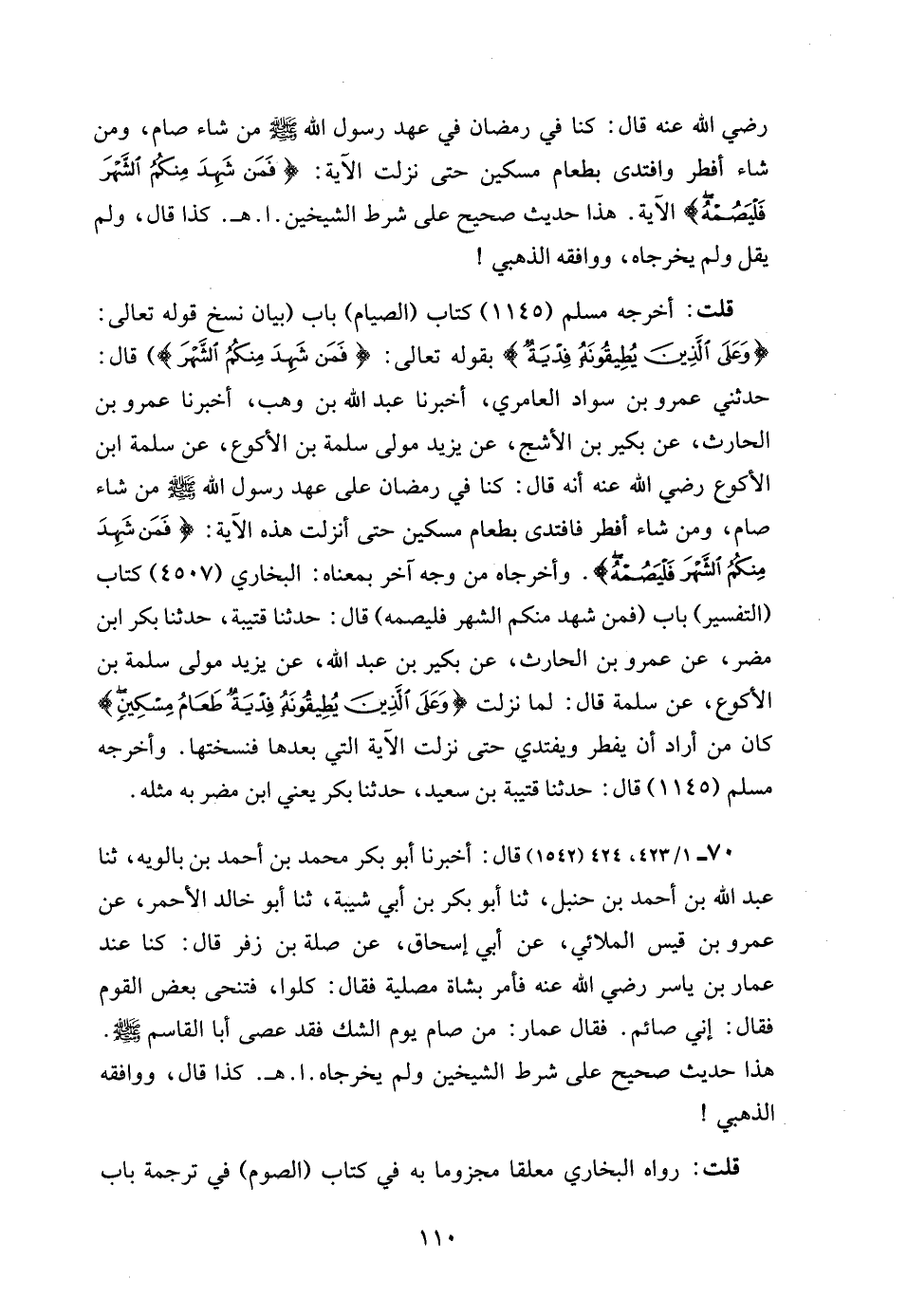 رضي الله عنه قال: كنا في رمضان في عهد رسول الله - صلى الله عليه وسلم - من شاء صام، ومن شاء أفطر وافتدى بطعام مسكين حتى نزلت الآية: {فَمَنْ شَهِدَ مِنْكُمُ الشَّهْرَ فَلْيَصُمْهُ} الآية. هذا حديث صحيح على شرط الشيخين. ا. هـ. كذا قال، ولم يقل ولم يخرجاه، ووافقه الذهبي!