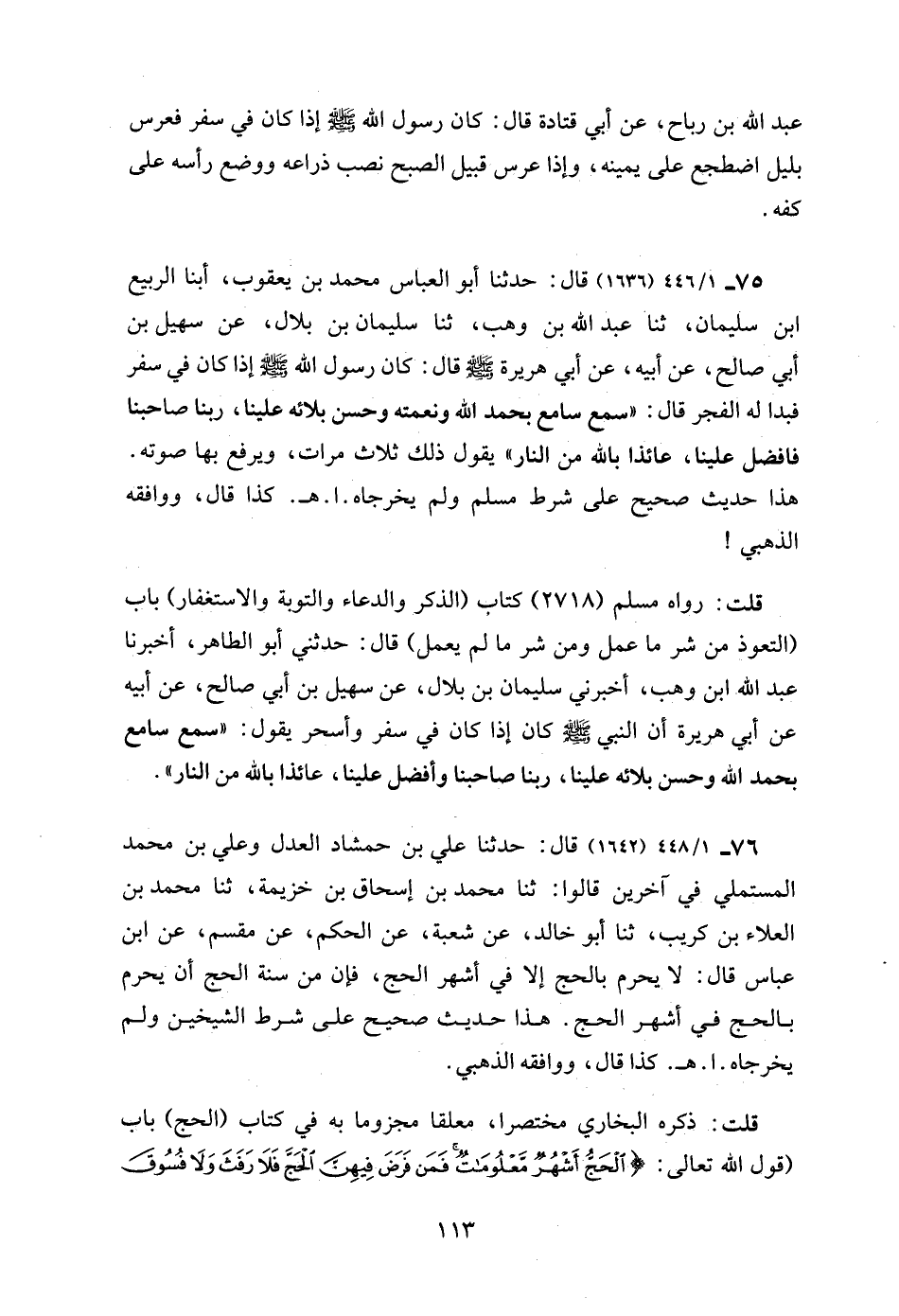 75 - 1/ 446 (1636) قال: حدثنا أبو العباس محمد بن يعقوب، أبنا الربيع ابن سليمان، ثنا عبد الله بن وهب، ثنا سليمان بن بلال، عن سهيل بن أبي صالح، عن أبيه، عن أبي هريرة - رضي الله عنه - قال: كان رسول الله - صلى الله عليه وسلم - إذا كان في سفر فبدا له الفجر قال: "سمع سامع بحمد الله ونعمته وحسن بلائه علينا، ربنا صاحبنا فافضل علينا، عائذا بالله من النار" يقول ذلك ثلاث مرات، ويرفع بها صوته. هذا حديث صحيح على شرط مسلم ولم يخرجاه. ا. هـ. كذا قال، ووافقه الذهبي!
