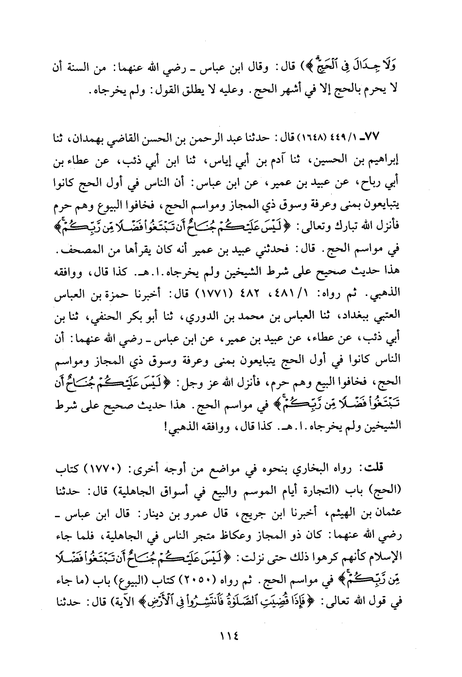 77 - 1/ 449 (1648) قال: حدثنا عبد الرحمن بن الحسن القاضي بهمدان، ثنا إبراهيم بن الحسين، ثنا آدم بن أبي إياس، ثنا ابن أبي ذئب، عن عطاء بن أبي رباح، عن عبيد بن عمير، عن ابن عباس: أن الناس في أول الحج كانوا يتبايعون بمنى وعرفة وسوق ذي المجاز ومواسم الحج، فخافوا البيوع وهم حرم فأنزل الله تبارك وتعالى: {لَيْسَ عَلَيْكُمْ جُنَاحٌ أَنْ تَبْتَغُوا فَضْلًا مِنْ رَبِّكُمْ} في مواسم الحج. قال: فحدثني عبيد بن عمير أنه كان يقرأها من المصحف. هذا حديث صحيح على شرط الشيخين ولم يخرجاه. ا. هـ. كذا قال، ووافقه الذهبي. ثم رواه: 1/ 481، 482 (1771) قال: أخبرنا حمزة بن العباس العتبي ببغداد، ثنا العباس بن محمد بن الدوري، ثنا أبو بكر الحنفي، ثنا بن أبي ذئب، عن عطاء، عن عبيد بن عمير، عن ابن عباس - رضي الله عنهما: أن الناس كانوا في أول الحج يتبايعون بمنى وعرفة وسوق ذي المجاز ومواسم الحج، فخافوا البيع وهم حرم، فانزل الله عز وجل: {لَيْسَ عَلَيْكُمْ جُنَاحٌ أَنْ تَبْتَغُوا فَضْلًا مِنْ رَبِّكُمْ} في مواسم الحج. هذا حديث صحيح على شرط الشيخين ولم يخرجاه. ا. هـ. كذا قال، ووافقه الذهبي!