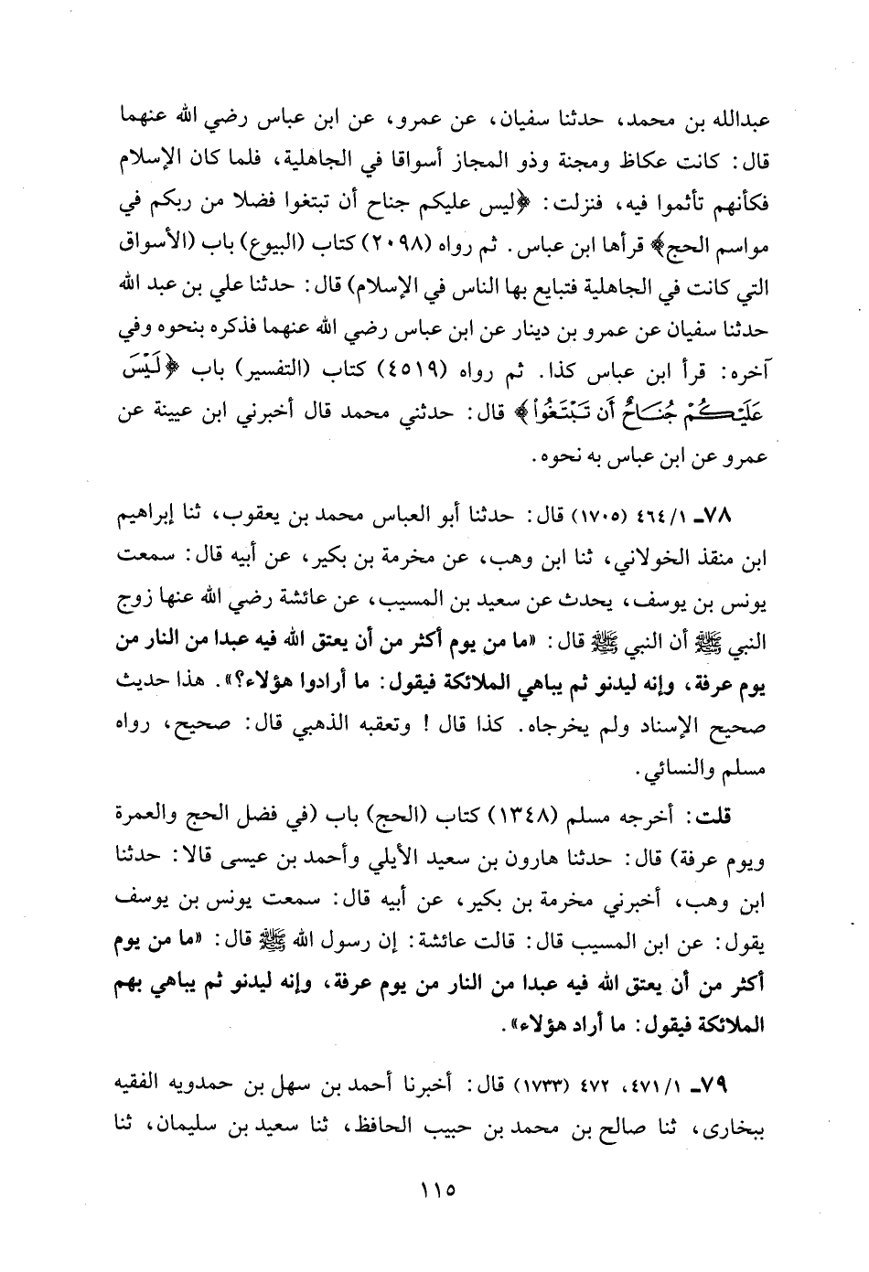 78 - 1/ 464 (1705) قال: حدثنا أبو العباس محمد بن يعقوب، ثنا إبراهيم ابن منقذ الخولاني، ثنا ابن وهب، عن مخرمة بن بكير، عن أبيه قال: سمعت يونس بن يوسف، يحدث عن سعيد بن المسيب، عن عائشة رضي الله عنها زوج النبي - صلى الله عليه وسلم - أن النبي - صلى الله عليه وسلم - قال: "ما من يوم أكثر من أن يعتق الله فيه عبدا من النار من يوم عرفة، وإنه ليدنو ثم يباهي الملائكة فيقول: ما أرادوا هؤلاء؟ ". هذا حديث صحيح الإسناد ولم يخرجاه. كذا قال! وتعقبه الذهبي قال: صحيح، رواه مسلم والنسائي.