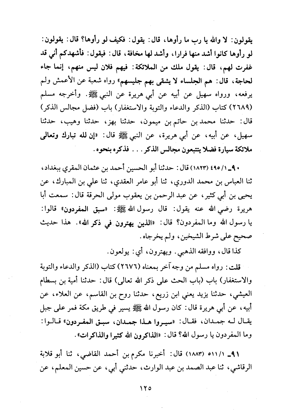 90 - 1/ 495 (1823) قال: حدثنا أبو الحسين أحمد بن عثمان المقري ببغداد، ثنا العباس بن محمد الدوري، ثنا أبو عامر العقدي، ثنا علي بن المبارك، عن يحيى بن أبي كثير، عن عبد الرحمن بن يعقوب مولى الحرقة قال: سمعت أبا هريرة رضي الله عنه يقول: قال رسول الله - صلى الله عليه وسلم -: "سبق المفردون" قالوا: يا رسول الله وما المفردون؟ قال: "الذين يهترون في ذكر الله". هذا حديث صحيح على شرط الشيخين، ولم يخرجاه.