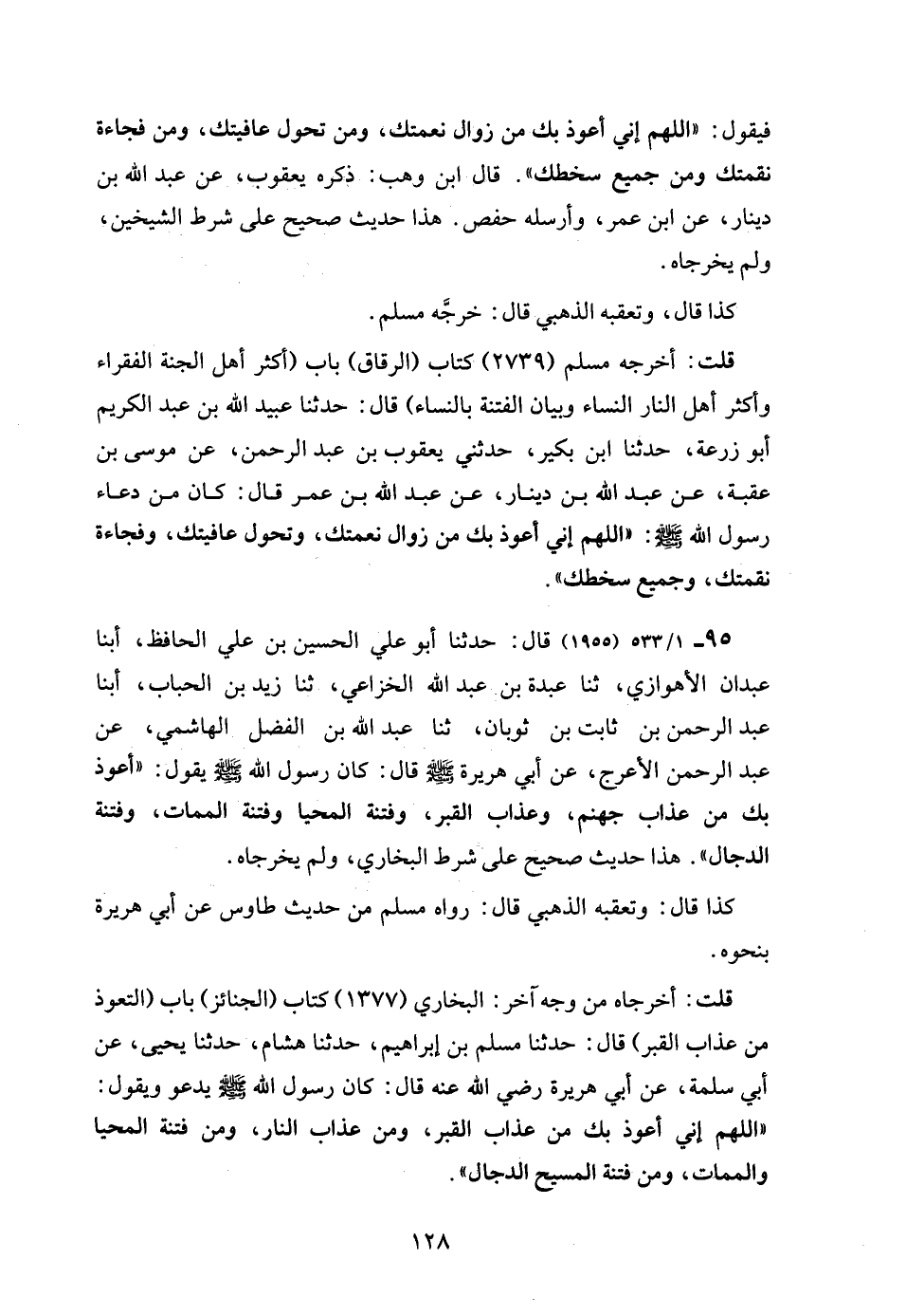 95 - 1/ 533 (1955) قال: حدثنا أبو علي الحسين بن علي الحافظ، أبنا عبدان الأهوازي، ثنا عبدة بن عبد الله الخزاعي، ثنا زيد بن الحباب، أبنا عبد الرحمن بن ثابت بن ثوبان، ثنا عبد الله بن الفضل الهاشمي، عن عبد الرحمن الأعرج، عن أبي هريرة - رضي الله عنه - قال: كان رسول الله - صلى الله عليه وسلم - يقول: "أعوذ بك من عذاب جهنم، وعذاب القبر، وفتنة المحيا وفتنة الممات، وفتنة الدجال". هذا حديث صحيح على شرط البخاري، ولم يخرجاه.