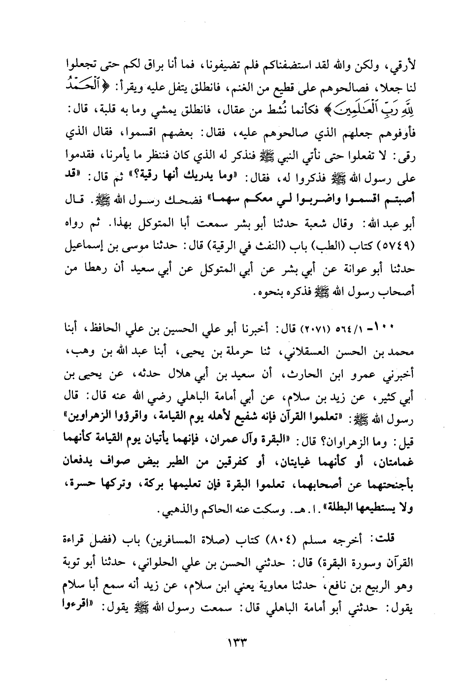 لأرقي، ولكن والله لقد استضفناكم فلم تضيفونا، فما أنا براق لكم حتى تجعلوا لنا جعلا، فصالحوهم على قطيع من الغنم، فانطلق يتفل عليه ويقرأ: {الْحَمْدُ لِلَّهِ رَبِّ الْعَالَمِينَ} فكأنما نُشط من عقال، فانطلق يمشي وما به قلبة، قال: فأوفوهم جعلهم الذي صالحوهم عليه، فقال: بعضهم اقسموا، فقال الذي رقى: لا تفعلوا حتى نأتي النبي - صلى الله عليه وسلم - فنذكر له الذي كان فننظر ما يأمرنا، فقدموا على رسول الله - صلى الله عليه وسلم - فذكروا له، فقال: "وما يدريك أنها رقية؟ " ثم قال: "قد أصبتم اقسموا واضربوا لي معكم سهما" فضحك رسول الله - صلى الله عليه وسلم -. قال أبو عبد الله: وقال شعبة حدثنا أبو بشر سمعت أبا المتوكل بهذا. ثم رواه (5749) كتاب (الطب) باب (النفث في الرقية) قال: حدثنا موسى بن إسماعيل حدثنا أبو عوانة عن أبي بشر عن أبي المتوكل عن أبي سعيد أن رهطا من أصحاب رسول الله - صلى الله عليه وسلم - فذكره بنحوه.