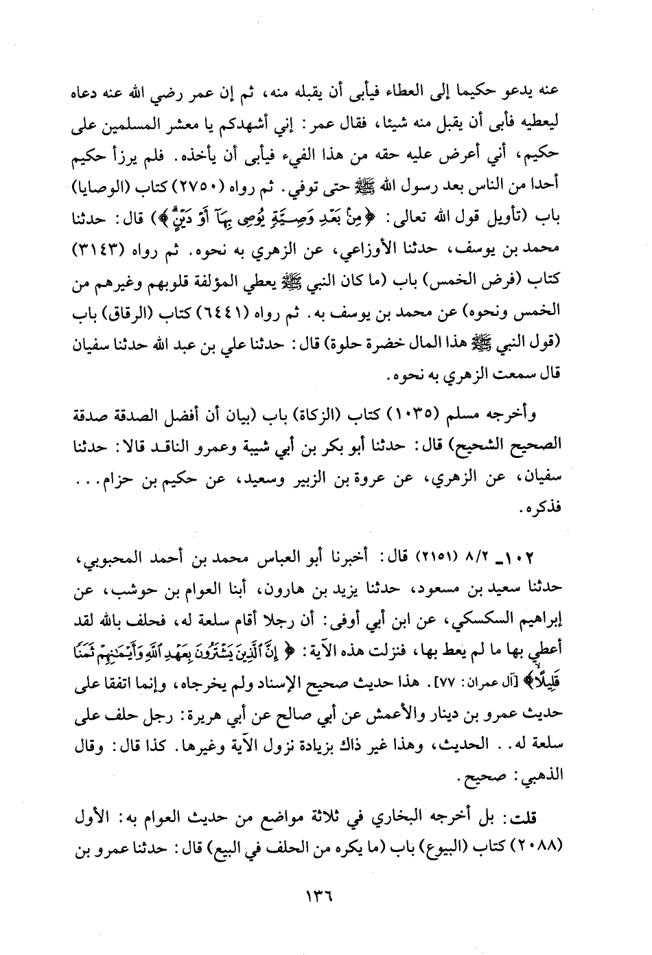 عنه يدعو حكيما إلى العطاء فيأبى أن يقبله منه، ثم إن عمر رضي الله عنه دعاه ليعطيه فأبى أن يقبل منه شيئا، فقال عمر: إني أشهدكم يا معشر المسلمين على حكيم، أني أعرض عليه حقه من هذا الفيء فيأبى أن يأخذه. فلم يرزأ حكيم أحدا من الناس بعد رسول الله - صلى الله عليه وسلم - حتى توفي. ثم رواه (2750) كتاب (الوصايا) باب (تأويل قول الله تعالى: {مِنْ بَعْدِ وَصِيَّةٍ يُوصِي بِهَا أَوْ دَيْنٍ}) قال: حدثنا محمد بن يوسف، حدثنا الأوزاعي، عن الزهري به نحوه. ثم رواه (3143) كتاب (فرض الخمس) باب (ما كان النبي - صلى الله عليه وسلم - يعطي المؤلفة قلوبهم وغيرهم من الخمس ونحوه) عن محمد بن يوسف به. ثم رواه (6441) كتاب (الرقاق) باب (قول النبي - صلى الله عليه وسلم - هذا المال خضرة حلوة) قال: حدثنا علي بن عبد الله حدثنا سفيان قال سمعت الزهري به نحوه.