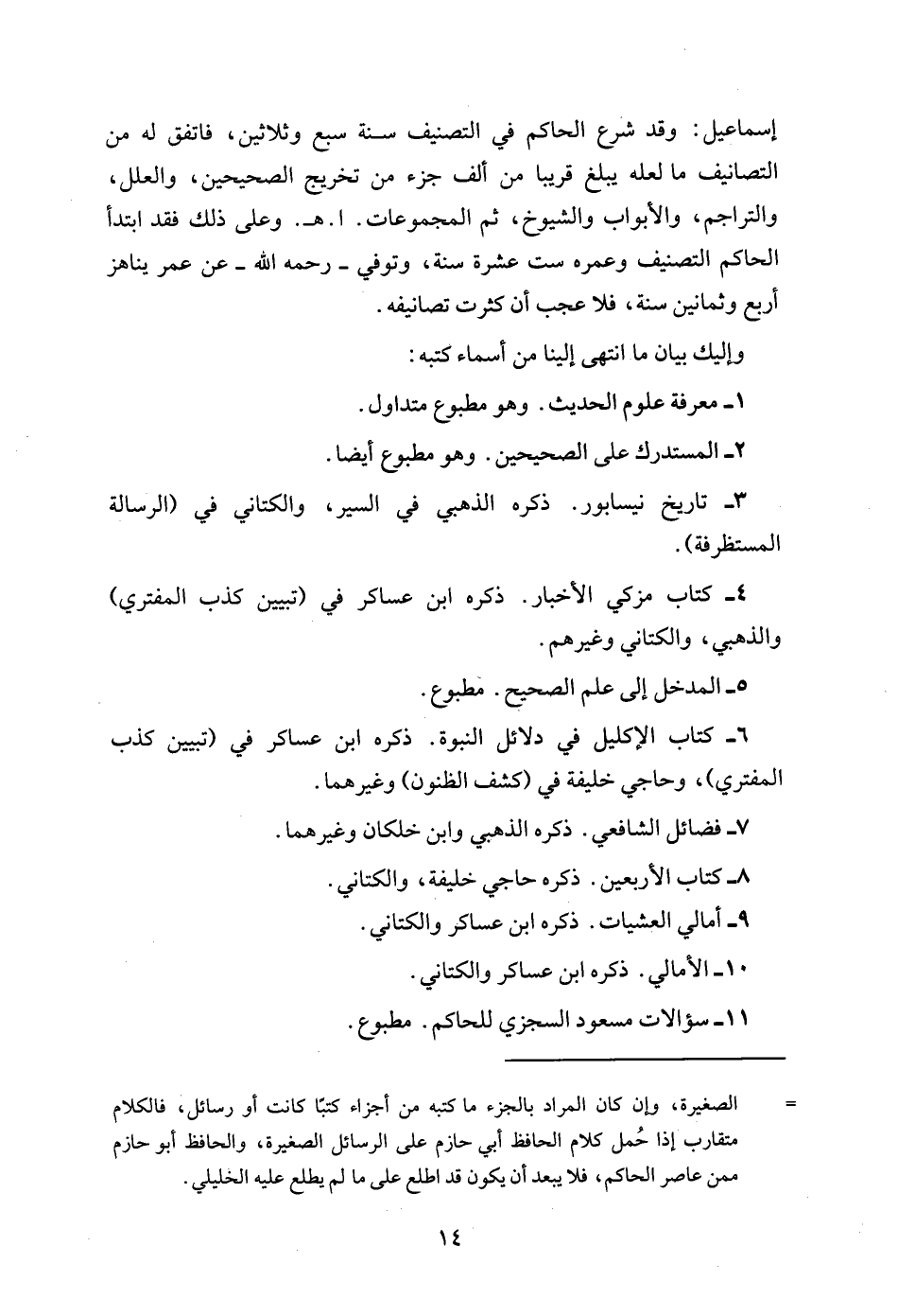 = الصغيرة، وإن كان المراد بالجزء ما كتبه من أجزاء كتبًا كانت أو رسائل، فالكلام متقارب إذا حُمل كلام الحافظ أبي حازم على الرسائل الصغيرة، والحافظ أبو حازم ممن عاصر الحاكم، فلا يبعد أن يكون قد اطلع على ما لم يطلع عليه الخليلي.
