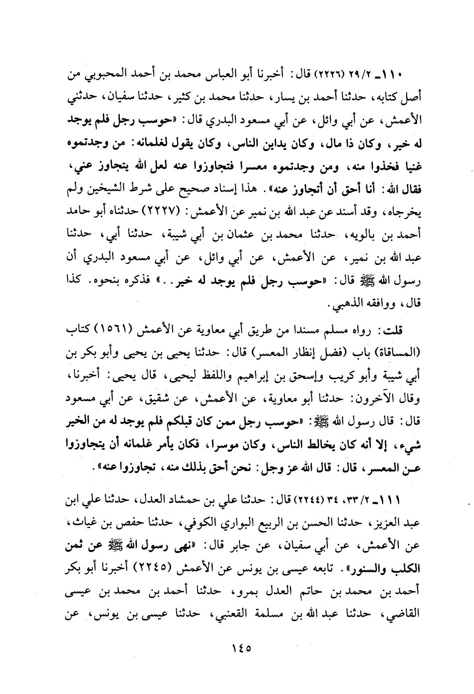 110 - 2/ 29 (2226) قال: أخبرنا أبو العباس محمد بن أحمد المحبوبي من أصل كتابه، حدثنا أحمد بن يسار، حدثنا محمد بن كثير، حدثنا سفيان، حدثني الأعمش، عن أبي وائل، عن أبي مسعود البدري قال: "حوسب رجل فلم يوجد له خير، وكان ذا مال، وكان يداين الناس، وكان يقول لغلمانه: من وجدتموه غنيا فخذوا منه، ومن وجدتموه معسرا فتجاوزوا عنه لعل الله يتجاوز عني، فقال الله: أنا أحق أن أتجاوز عنه". هذا إسناد صحيح على شرط الشيخين ولم يخرجاه، وقد أسند عن عبد الله بن نمير عن الأعمش: (2227) حدثناه أبو حامد أحمد بن بالويه، حدثنا محمد بن عثمان بن أبي شيبة، حدثنا أبي، حدثنا عبد الله بن نمير، عن الأعمش، عن أبي وائل، عن أبي مسعود البدري أن رسول الله - صلى الله عليه وسلم - قال: "حوسب رجل فلم يوجد له خير .. " فذكره بنحوه. كذا قال، ووافقه الذهبي.