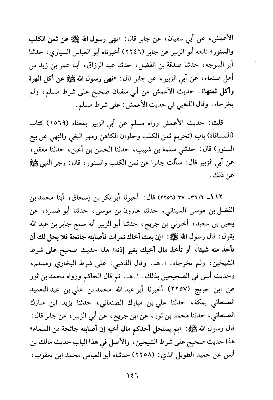 الأعمش، عن أبي سفيان، عن جابر قال: "نهى رسول الله - صلى الله عليه وسلم - عن ثمن الكلب والسنور" تابعه أبو الزبير عن جابر (2246) أخبرناه أبو العباس السياري، حدثنا أبو الموجه، حدثنا صدقة بن الفضل، حدثنا عبد الرزاق، أبنا عمر بن زيد من أهل صنعاء، عن أبي الزبير، عن جابر قال: "نهى رسول الله - صلى الله عليه وسلم - عن أكل الهرة وأكل ثمنها". حديث الأعمش عن أبي سفيان صحيح على شرط مسلم، ولم يخرجاه. وقال الذهبي في حديث الأعمش: على شرط مسلم.