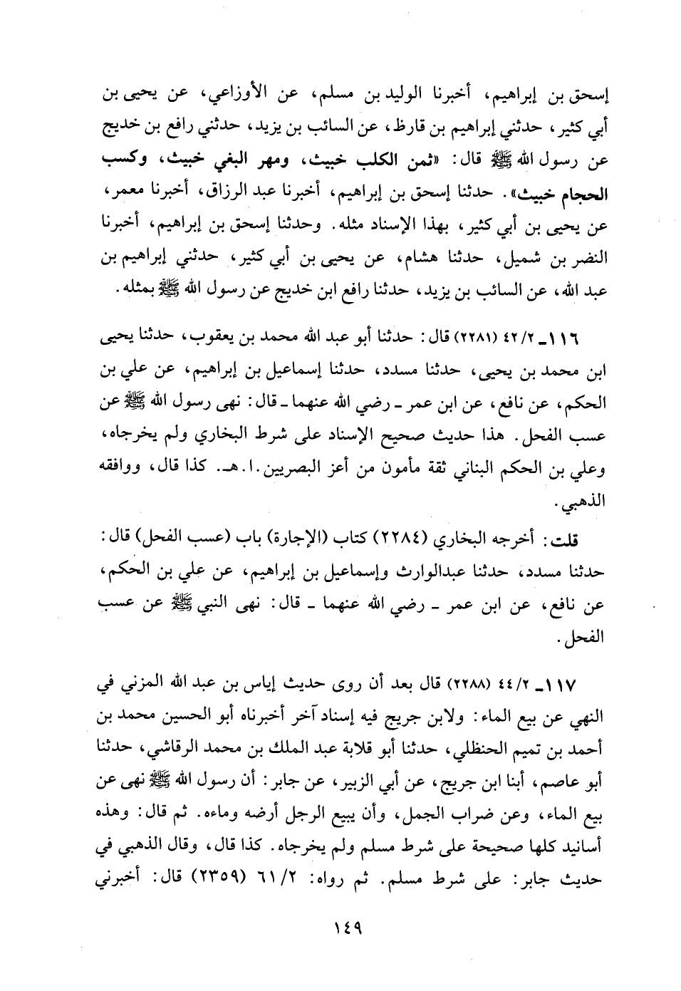116 - 2/ 42 (2281) قال: حدثنا أبو عبد الله محمد بن يعقوب، حدثنا يحيى ابن محمد بن يحيى، حدثنا مسدد، حدثنا إسماعيل بن إبراهيم، عن علي بن الحكم، عن نافع، عن ابن عمر - رضي الله عنهما - قال: نهى رسول الله - صلى الله عليه وسلم - عن عسب الفحل. هذا حديث صحيح الإسناد على شرط البخاري ولم يخرجاه، وعلي بن الحكم البناني ثقة مأمون من أعز البصريين. ا. هـ. كذا قال، ووافقه الذهبي.