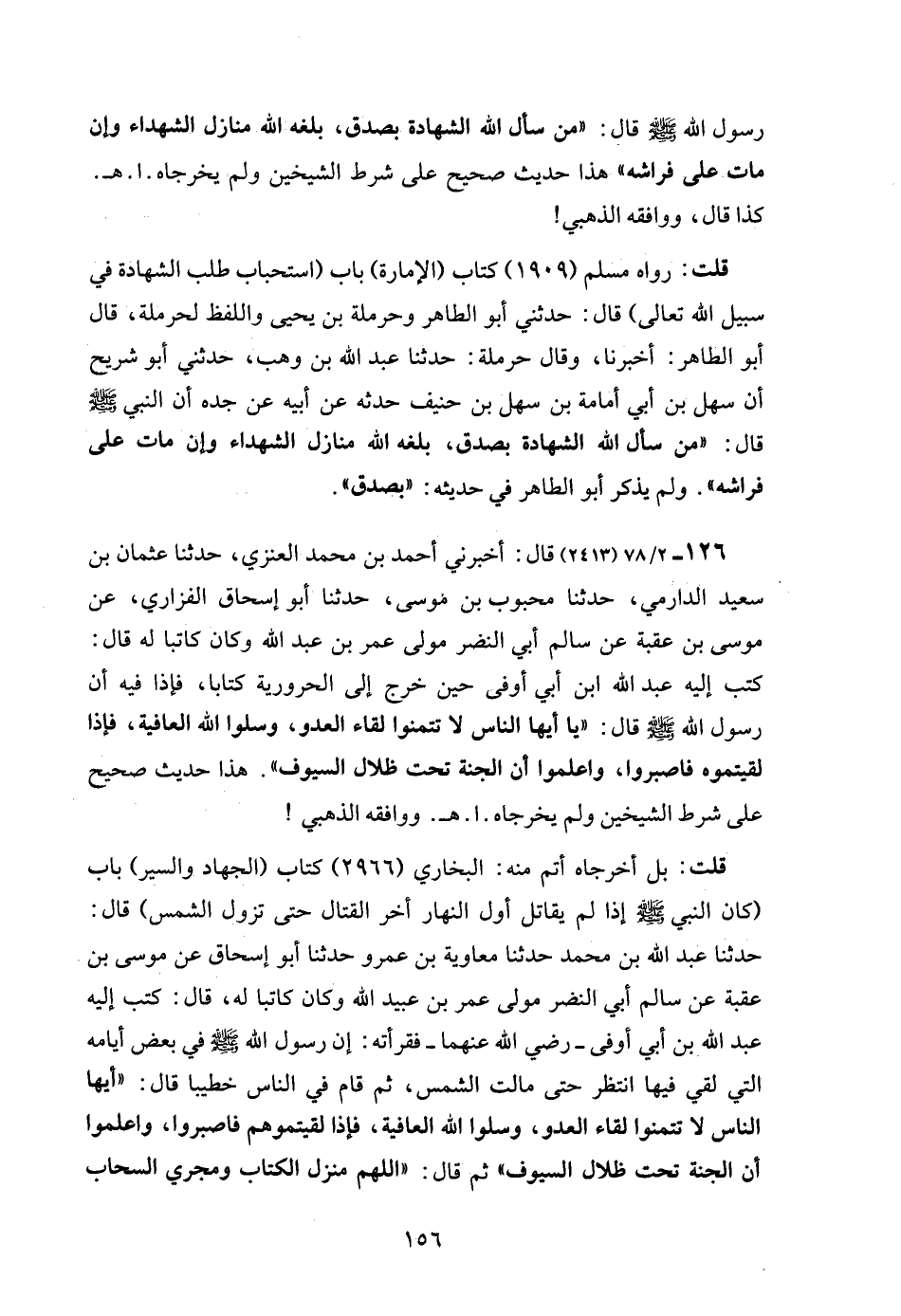 126 - 2/ 78 (2413) قال: أخبرني أحمد بن محمد العنزي، حدثنا عثمان بن سعيد الدارمي، حدثنا محبوب بن موسى، حدثنا أبو إسحاق الفزاري، عن موسى بن عقبة عن سالم أبي النضر مولى عمر بن عبد الله وكان كاتبا له قال: كتب إليه عبد الله ابن أبي أوفى حين خرج إلى الحرورية كتابا، فإذا فيه أن رسول الله - صلى الله عليه وسلم - قال: "يا أيها الناس لا تتمنوا لقاء العدو، وسلوا الله العافية، فإذا لقيتموه فاصبروا، واعلموا أن الجنة تحت ظلال السيوف". هذا حديث صحيح على شرط الشيخين ولم يخرجاه. ا. هـ. ووافقه الذهبي!