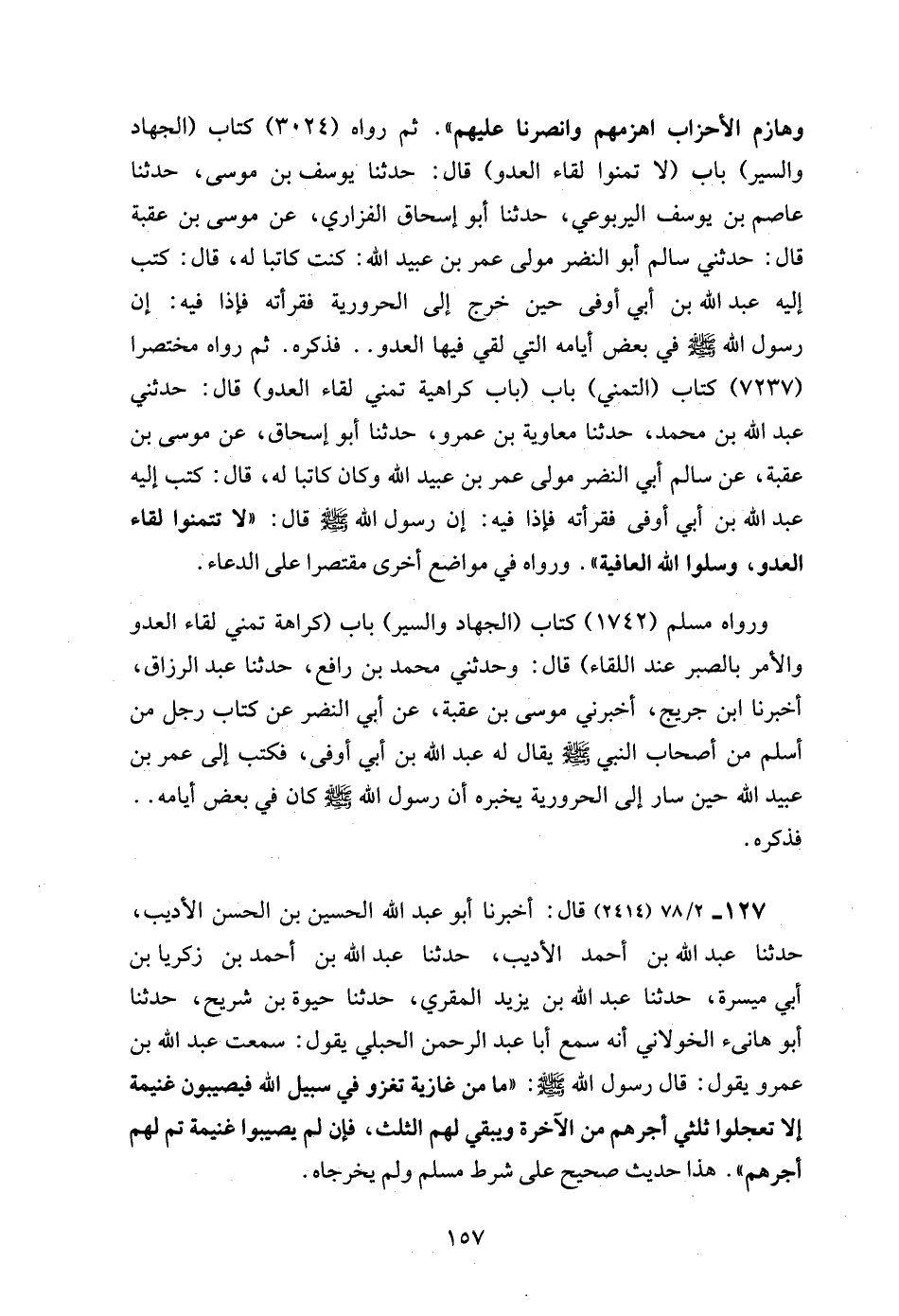 ورواه مسلم (1742) كتاب (الجهاد والسير) باب (كراهة تمني لقاء العدو والأمر بالصبر عند اللقاء) قال: وحدثني محمد بن رافع، حدثنا عبد الرزاق، أخبرنا ابن جريج، أخبرني موسى بن عقبة، عن أبي النضر عن كتاب رجل من أسلم من أصحاب النبي - صلى الله عليه وسلم - يقال له عبد الله بن أبي أوفى، فكتب إلى عمر بن عبيد الله حين سار إلى الحرورية يخبره أن رسول الله - صلى الله عليه وسلم - كان في بعض أيامه .. فذكره.