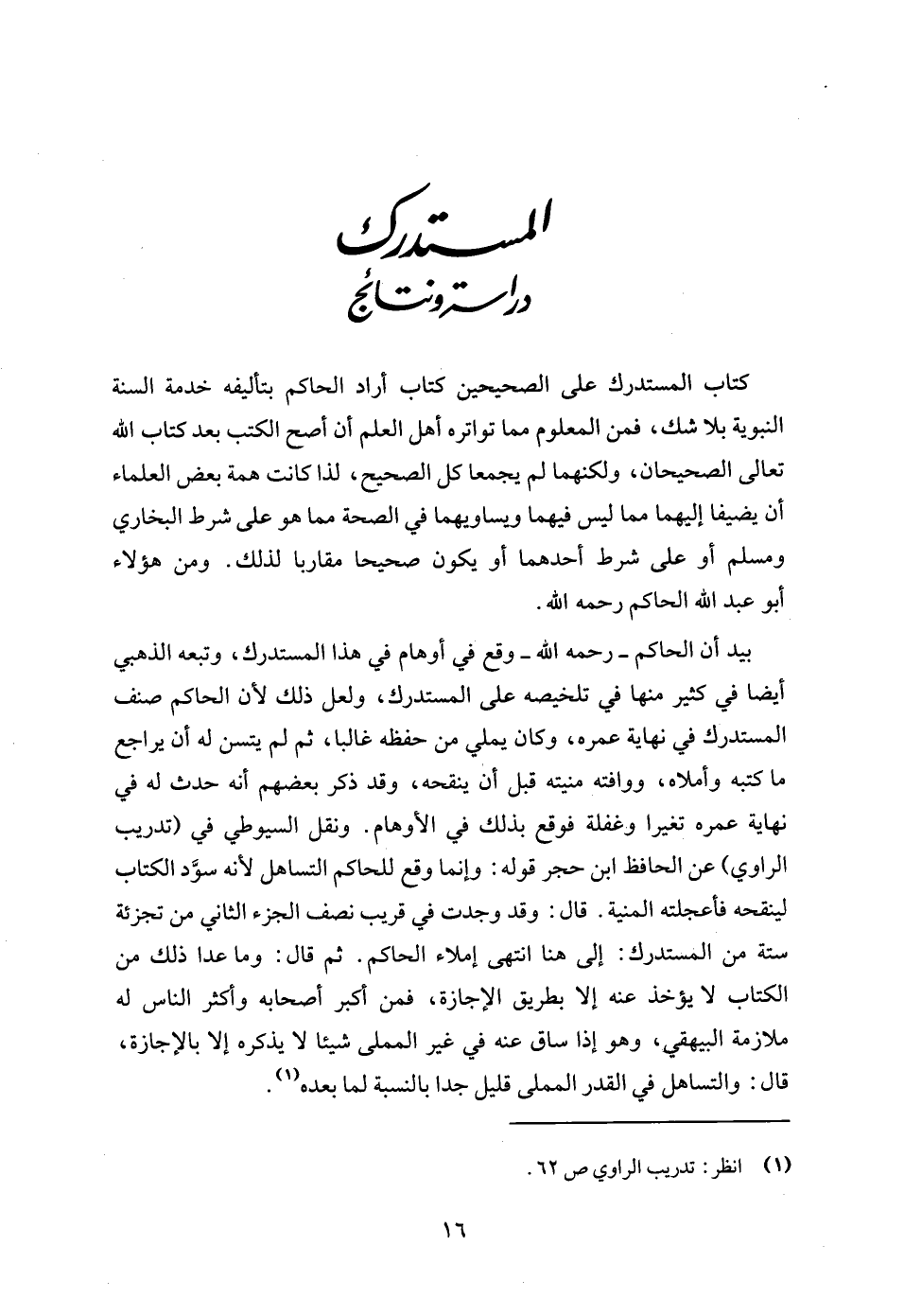 بيد أن الحاكم - رحمه الله - وقع في أوهام في هذا المستدرك، وتبعه الذهبي أيضا في كثير منها في تلخيصه على المستدرك، ولعل ذلك لأن الحاكم صنف المستدرك في نهاية عمره، وكان يملي من حفظه غالبا، ثم لم يتسن له أن يراجع ما كتبه وأملاه، ووافته منيته قبل أن ينقحه، وقد ذكر بعضهم أنه حدث له في نهاية عمره تغيرا وغفلة فوقع بذلك في الأوهام. ونقل السيوطي في (تدريب الراوي) عن الحافظ ابن حجر قوله: وإنما وقع للحاكم التساهل لأنه سوَّد الكتاب لينقحه فأعجلته المنية. قال: وقد وجدت في قريب نصف الجزء الثاني من تجزئة ستة من المستدرك: إلى هنا انتهى إملاء الحاكم. ثم قال: وما عدا ذلك من الكتاب لا يؤخذ عنه إلا بطريق الإجازة، فمن الأكبر أصحابه وأكثر الناس له ملازمة البيهقي، وهو إذا ساق عنه في غير المملى شيئا لا يذكره إلا بالإجازة، قال: والتساهل في القدر المملى قليل جدا بالنسبة لما بعده (¬1).