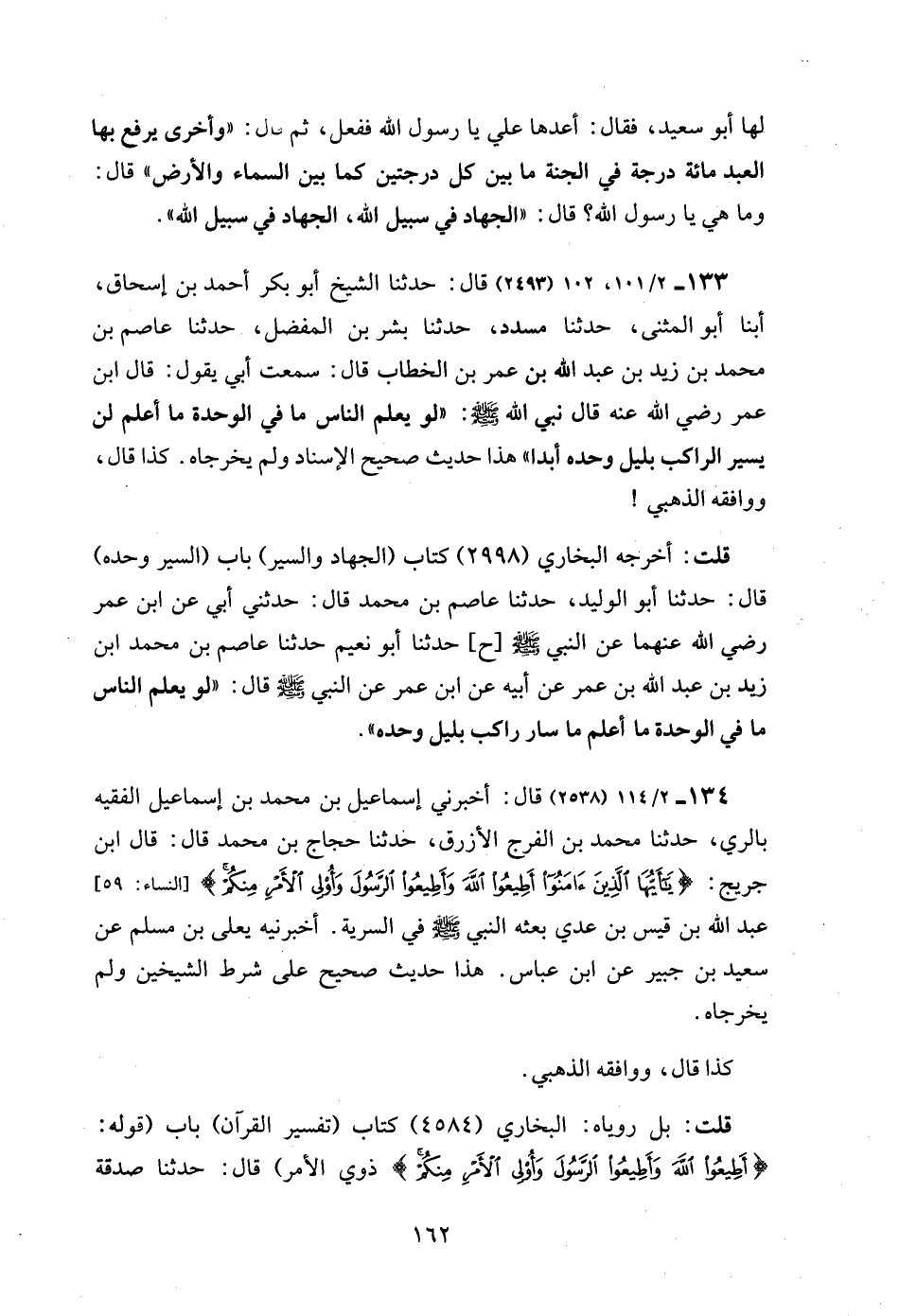133 - 2/ 101، 102 (2493) قال: حدثنا الشيخ أبو بكر أحمد بن إسحاق، أبنا أبو المثنى، حدثنا مسدد، حدثنا بشر بن المفضل، حدثنا عاصم بن محمد بن زيد بن عبد الله بن عمر بن الخطاب قال: سمعت أبي يقول: قال ابن عمر رضي الله عنه قال نبي الله - صلى الله عليه وسلم -: "لو يعلم الناس ما في الوحدة ما أعلم لن يسير الراكب بليل وحده أبدا" هذا حديث صحيح الإسناد ولم يخرجاه. كذا قال، ووافقه الذهبي!