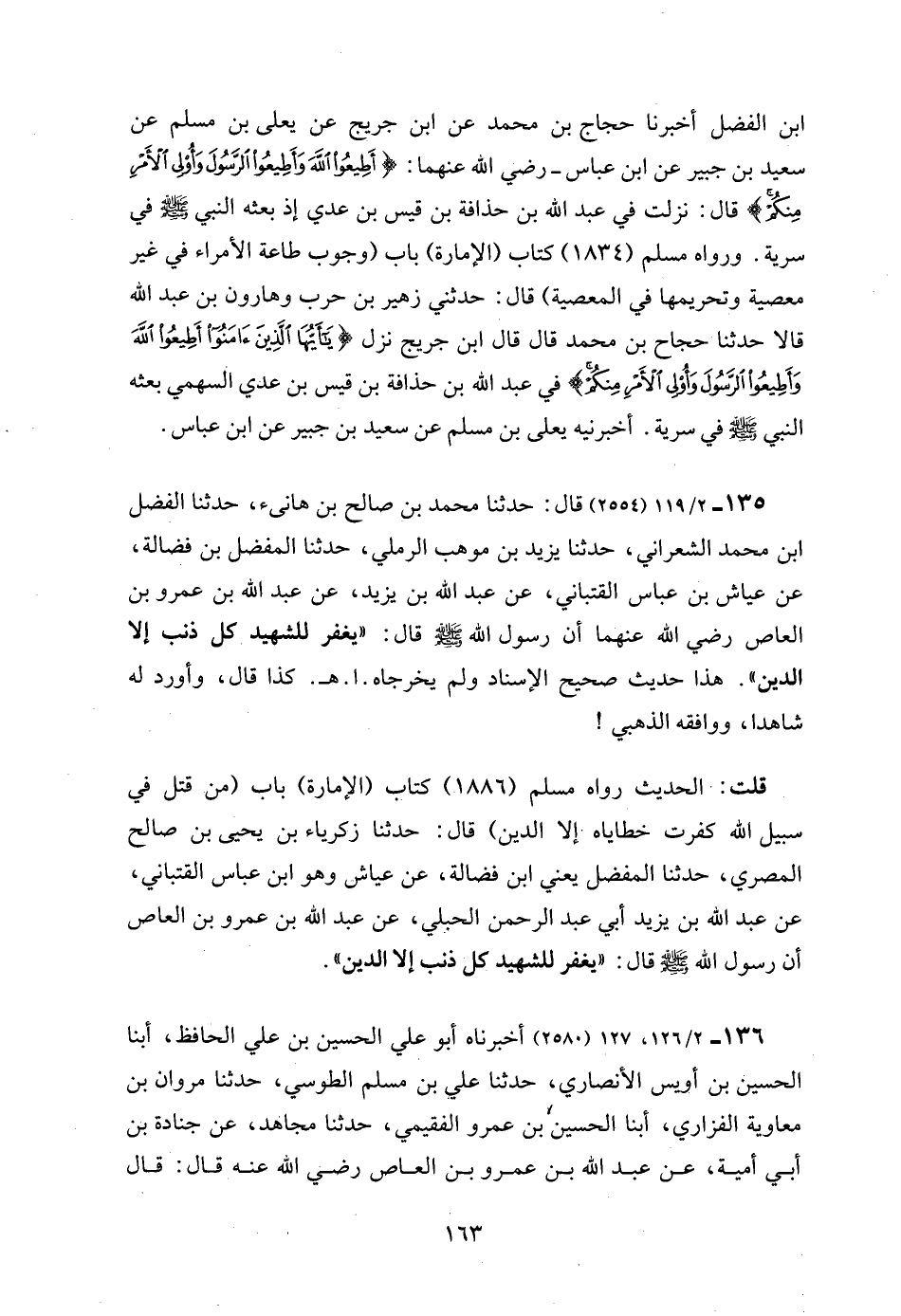 135 - 2/ 119 (2554) قال: حدثنا محمد بن صالح بن هانئ، حدثنا الفضل ابن محمد الشعراني، حدثنا يزيد بن موهب الرملي، حدثنا المفضل بن فضالة، عن عياش بن عباس القتباني، عن عبد الله بن يزيد، عن عبد الله بن عمرو بن العاص رضي الله عنهما أن رسول الله - صلى الله عليه وسلم - قال: "يغفر للشهيد كل ذنب إلا الدين". هذا حديث صحيح الإسناد ولم يخرجاه. ا. هـ. كذا قال، وأورد له شاهدا، ووافقه الذهبي!
