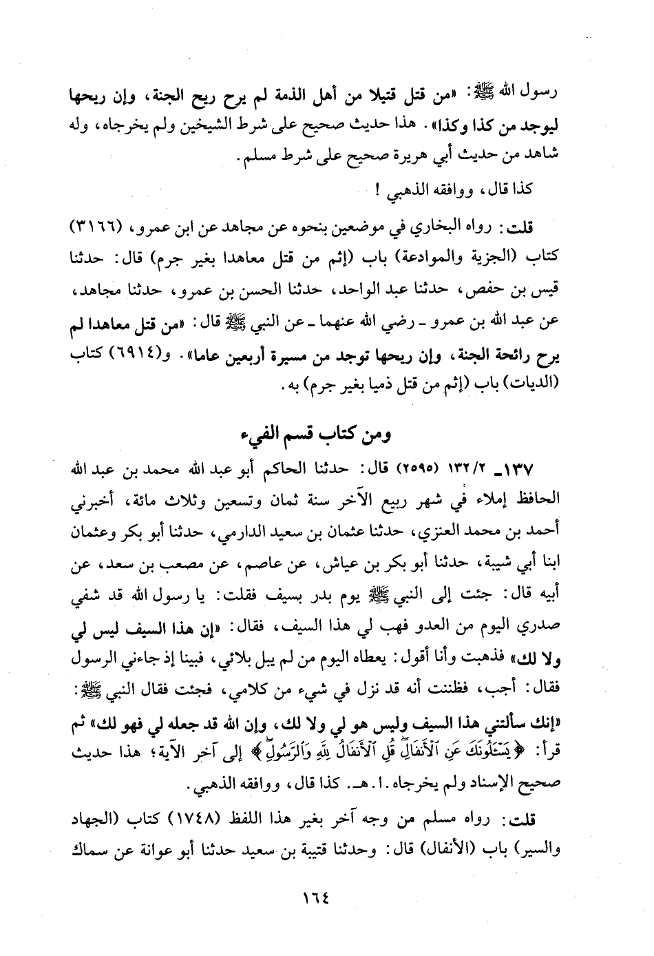 رسول الله - صلى الله عليه وسلم -: "من قتل قتيلا من أهل الذمة لم يرح ريح الجنة، وإن ريحها ليوجد من كذا وكذا". هذا حديث صحيح على شرط الشيخين ولم يخرجاه، وله شاهد من حديث أبي هريرة صحيح على شرط مسلم.