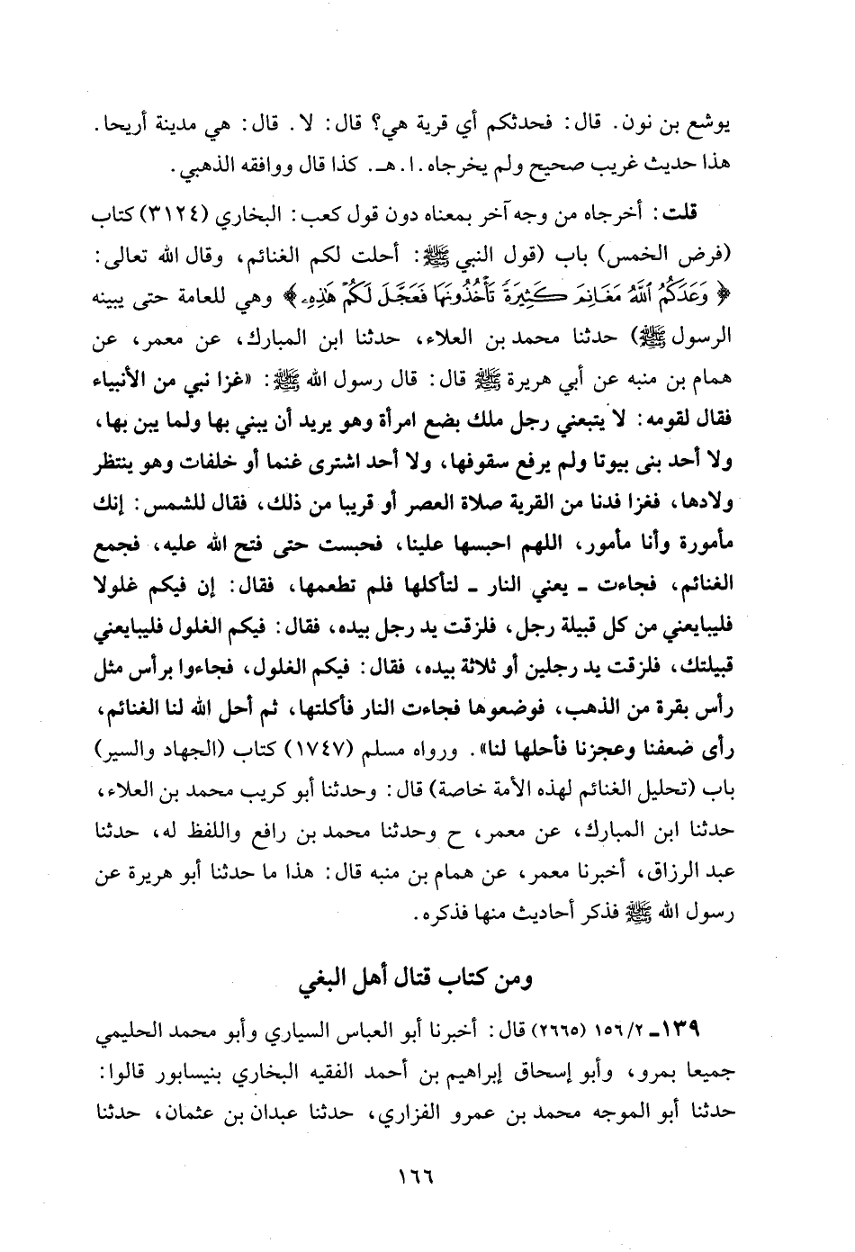 قلت: أخرجاه من وجه آخر بمعناه دون قول كعب: البخاري (3124) كتاب (فرض الخمس) باب (قول النبي - صلى الله عليه وسلم -: أحلت لكم الغنائم، وقال الله تعالى: {وَعَدَكُمُ اللَّهُ مَغَانِمَ كَثِيرَةً تَأْخُذُونَهَا فَعَجَّلَ لَكُمْ هَذِهِ} وهي للعامة حتى يبينه الرسول - صلى الله عليه وسلم -) حدثنا محمد بن العلاء، حدثنا ابن المبارك، عن معمر، عن همام بن منبه عن أبي هريرة - رضي الله عنه - قال: قال رسول الله - صلى الله عليه وسلم -: "غزا نبي من الأنبياء فقال لقومه: لا يتبعني رجل ملك بضع امرأة وهو يريد أن يبني بها ولما يبن بها، ولا أحد بنى بيوتا ولم يرفع سقوفها، ولا أحد اشترى غنما أو خلفات وهو ينتظر ولادها، فغزا فدنا من القرية صلاة العصر أو قريبا من ذلك، فقال للشمس: إنك مأمورة وأنا مأمور، اللهم احبسها علينا، فحبست حتى فتح الله عليه، فجمع الغنائم، فجاءت - يعني النار - لتأكلها فلم تطعمها، فقال: إن فيكم غلولا فليبايعني من كل قبيلة رجل، فلزقت يد رجل بيده، فقال: فيكم الغلول فليبايعني قبيلتك، فلزقت يد رجلين أو ثلاثة بيده، فقال: فيكم الغلول، فجاءوا برأس مثل رأس بقرة من الذهب، فوضعوها فجاءت النار فأكلتها، ثم أحل الله لنا الغنائم، رأى ضعفنا وعجزنا فأحلها لنا". ورواه مسلم (1747) كتاب (الجهاد والسير) باب (تحليل الغنائم لهذه الأمة خاصة) قال: وحدثنا أبو كريب محمد بن العلاء، حدثنا ابن المبارك، عن معمر، ح وحدثنا محمد بن رافع واللفظ له، حدثنا عبد الرزاق، أخبرنا معمر، عن همام بن منبه قال: هذا ما حدثنا أبو هريرة عن رسول الله - صلى الله عليه وسلم - فذكر أحاديث منها فذكره.