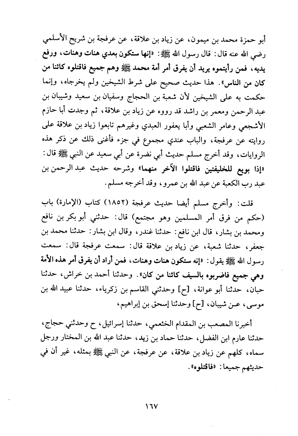 قلت: وأخرج مسلم أيضا حديث عرفجة (1852) كتاب (الإمارة) باب (حكم من فرق أمر المسلمين وهو مجتمع) قال: حدثني أبو بكر بن نافع ومحمد بن بشار، قال ابن نافع: حدثنا غندر، وقال ابن بشار: حدثنا محمد بن جعفر، حدثنا شعبة، عن زياد بن علاقة قال: سمعت عرفجة قال: سمعت رسول الله - صلى الله عليه وسلم - يقول: "إنه ستكون هنات وهنات، فمن أراد أن يفرق أمر هذه الأمة وهي جميع فاضربوه بالسيف كائنا من كان". وحدثنا أحمد بن خراش، حدثنا حبان، حدثنا أبو عوانة، [ح] وحدثني القاسم بن زكرياء، حدثنا عبيد الله بن موسى، عن شيبان، [ح] وحدثنا إسحق بن إبراهيم,