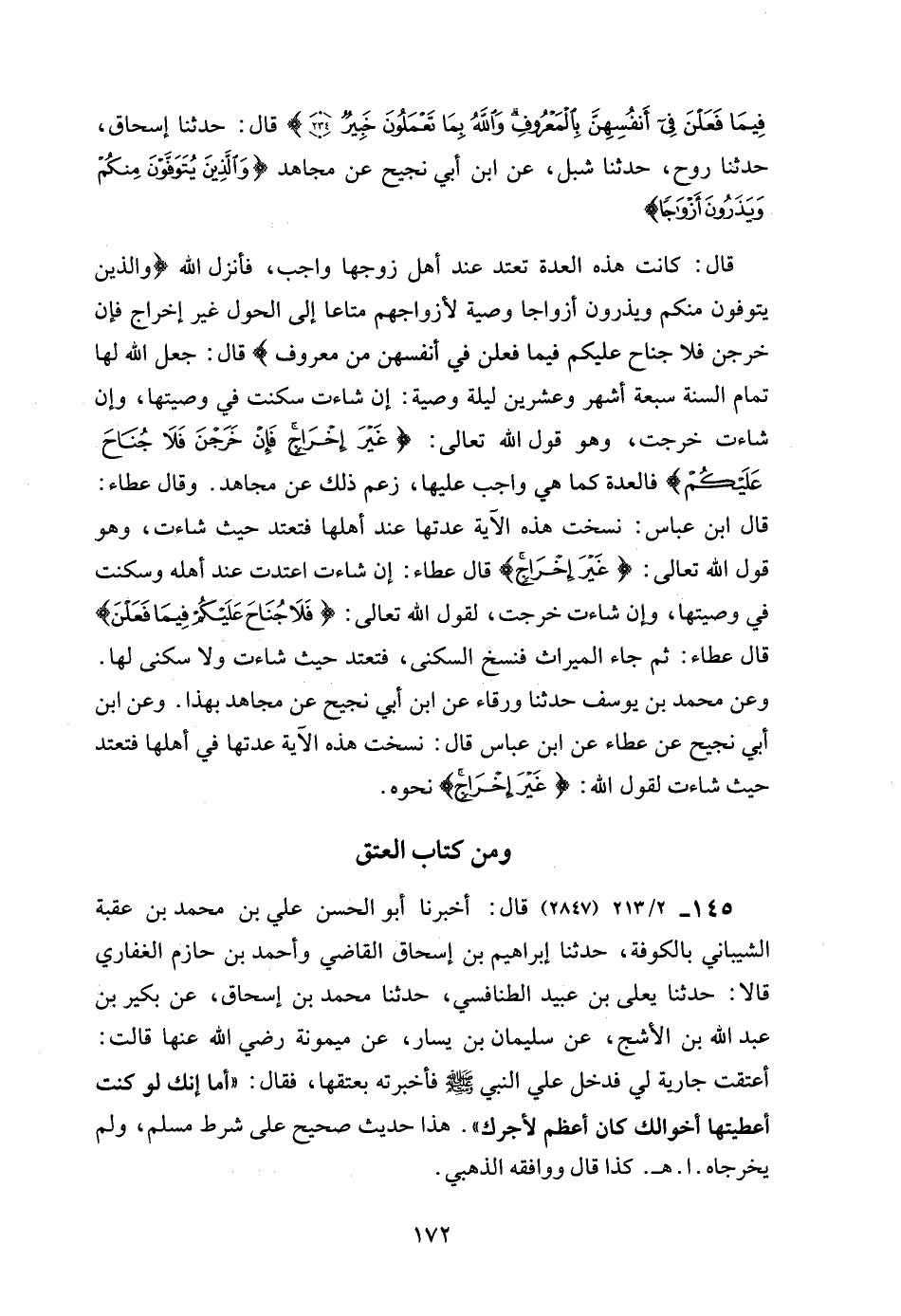 قال: كانت هذه العدة تعتد عند أهل زوجها واجب، فأنزل الله {وَالَّذِينَ يُتَوَفَّوْنَ مِنْكُمْ وَيَذَرُونَ أَزْوَاجًا وَصِيَّةً لِأَزْوَاجِهِمْ مَتَاعًا إِلَى الْحَوْلِ غَيْرَ إِخْرَاجٍ فَإِنْ خَرَجْنَ فَلَا جُنَاحَ عَلَيْكُمْ فِي مَا فَعَلْنَ فِي أَنْفُسِهِنَّ مِنْ مَعْرُوفٍ} قال: جعل الله لها تمام السنة سبعة أشهر وعشرين ليلة وصية: إن شاءت سكنت في وصيتها، وإن شاءت خرجت، وهو قول الله تعالى: {غَيْرَ إِخْرَاجٍ فَإِنْ خَرَجْنَ فَلَا جُنَاحَ عَلَيْكُمْ} فالعدة كما هي واجب عليها، زعم ذلك عن مجاهد. وقال عطاء: قال ابن عباس: نسخت هذه الآية عدتها عند أهلها فتعتد حيث شاءت، وهو قول الله تعالى: {غَيْرَ إِخْرَاجٍ} قال عطاء: إن شاءت اعتدت عند أهله وسكنت في وصيتها، وإن شاءت خرجت، لقول الله تعالى: {فَلَا جُنَاحَ عَلَيْكُمْ فِيمَا فَعَلْنَ} قال عطاء: ثم جاء الميراث فنسخ السكنى، فتعتد حيث شاءت ولا سكنى لها. وعن محمد بن يوسف حدثنا ورقاء عن ابن أبي نجيح عن مجاهد بهذا. وعن ابن أبي نجيح عن عطاء عن ابن عباس قال: نسخت هذه الآية عدتها في أهلها فتعتد حيث شاءت لقول الله: {غَيْرَ إِخْرَاجٍ} نحوه.