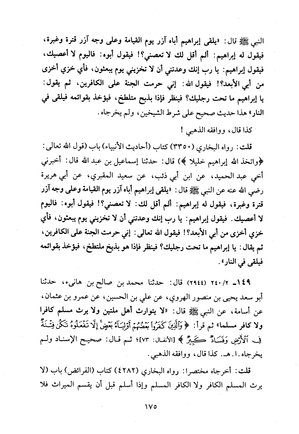 149 - 2/ 240 (2944) قال: حدثنا محمد بن صالح بن هانئ، حدثنا أبو سعد يحيى بن منصور الهروي، عن علي بن الحسين، عن عمرو بن عثمان، عن أسامة، عن النبي - صلى الله عليه وسلم - قال: "لا يتوارث أهل ملتين ولا يرث مسلم كافرا ولا كافر مسلما" ثم قرأ: {وَالَّذِينَ كَفَرُوا بَعْضُهُمْ أَوْلِيَاءُ بَعْضٍ إِلَّا تَفْعَلُوهُ تَكُنْ فِتْنَةٌ فِي الْأَرْضِ وَفَسَادٌ كَبِيرٌ} [الأنفال: 73]؛ ثم قال: صحيح الإسناد ولم يخرجاه. ا. هـ. كذا قال، ووافقه الذهبي.