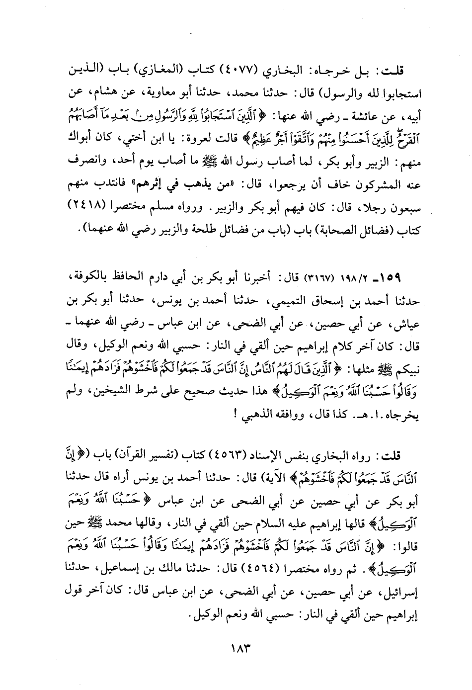 159 - 2/ 198 (3167) قال: أخبرنا أبو بكر بن أبي دارم الحافظ بالكوفة، حدثنا أحمد بن إسحاق التميمي، حدثنا أحمد بن يونس، حدثنا أبو بكر بن عياش، عن أبي حصين، عن أبي الضحى، عن ابن عباس - رضي الله عنهما - قال: كان آخر كلام إبراهيم حين ألقي في النار: حسبي الله ونعم الوكيل، وقال نبيكم - صلى الله عليه وسلم - مثلها: {الَّذِينَ قَالَ لَهُمُ النَّاسُ إِنَّ النَّاسَ قَدْ جَمَعُوا لَكُمْ فَاخْشَوْهُمْ فَزَادَهُمْ إِيمَانًا وَقَالُوا حَسْبُنَا اللَّهُ وَنِعْمَ الْوَكِيلُ} هذا حديث صحيح على شرط الشيخين، ولم يخرجاه. ا. هـ. كذا قال، ووافقه الذهبي!