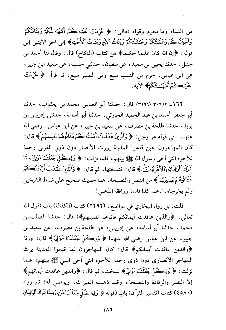 162 - 2/ 306 (3196) قال: حدثنا أبو العباس محمد بن يعقوب، حدثنا أبو جعفر أحمد بن عبد الحميد الحارثي، حدثنا أبو أسامة، حدثني إدريس بن يزيد، حدثنا طلحة بن مصرف، عن سعيد بن جبير، عن ابن عباس - رضي الله عنهما - في قوله عز وجل: {وَالَّذِينَ عَقَدَتْ أَيْمَانُكُمْ فَآتُوهُمْ نَصِيبَهُمْ} قال: كان المهاجرون حين قدموا المدينة يورث الأنصار دون ذوي القربى رحمة للأخوة التي آخى رسول الله - صلى الله عليه وسلم - بينهم، فلما نزلت: {وَلِكُلٍّ جَعَلْنَا مَوَالِيَ مِمَّا تَرَكَ الْوَالِدَانِ وَالْأَقْرَبُونَ} قال: فنسختها، ثم قال: {وَالَّذِينَ عَقَدَتْ أَيْمَانُكُمْ فَآتُوهُمْ نَصِيبَهُمْ} من النصر والنصيحة. هذا حديث صحيح على شرط الشيخين ولم يخرجاه. ا. هـ. كذا قال، ووافقه الذهبي!