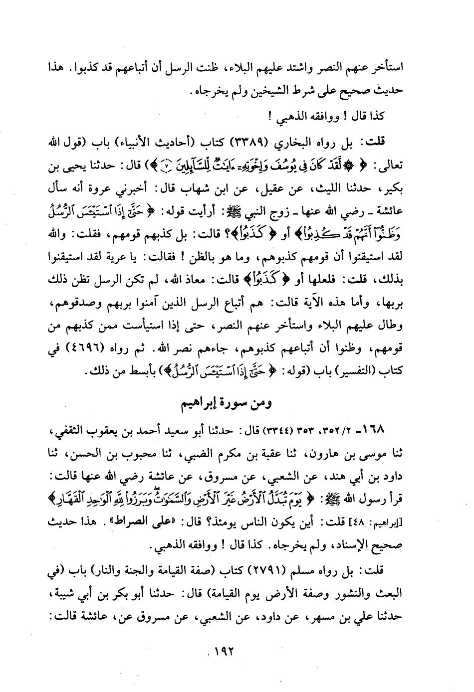 قلت: بل رواه البخاري (3389) كتاب (أحاديث الأنبياء) باب (قول الله تعالى: {لَقَدْ كَانَ فِي يُوسُفَ وَإِخْوَتِهِ آيَاتٌ لِلسَّائِلِينَ (7)}) قال: حدثنا يحيى بن بكير، حدثنا الليث، عن عقيل، عن ابن شهاب قال: أخبرني عروة أنه سأل عائشة - رضي الله عنها - زوج النبي - صلى الله عليه وسلم -: أرأيت قوله: {حَتَّى إِذَا اسْتَيْأَسَ الرُّسُلُ وَظَنُّوا أَنَّهُمْ قَدْ كُذِبُوا} أو {كَذَبُوا}؟ قالت: بل كذبهم قومهم، فقلت: والله لقد استيقنوا أن قومهم كذبوهم، وما هو بالظن! فقالت: يا عرية لقد استيقنوا بذلك، قلت: فلعلها أو {كَذَبُوا} قالت: معاذ الله، لم تكن الرسل تظن ذلك بربها، وأما هذه الآية قالت: هم أتباع الرسل الذين آمنوا بربهم وصدقوهم، وطال عليهم البلاء واستأخر عنهم النصر، حتى إذا استيأست ممن كذبهم من قومهم، وظنوا أن أتباعهم كذبوهم، جاءهم نصر الله. ثم رواه (4696) في كتاب (التفسير) باب (قوله: {حَتَّى إِذَا اسْتَيْأَسَ الرُّسُلُ}) بأبسط من ذلك.