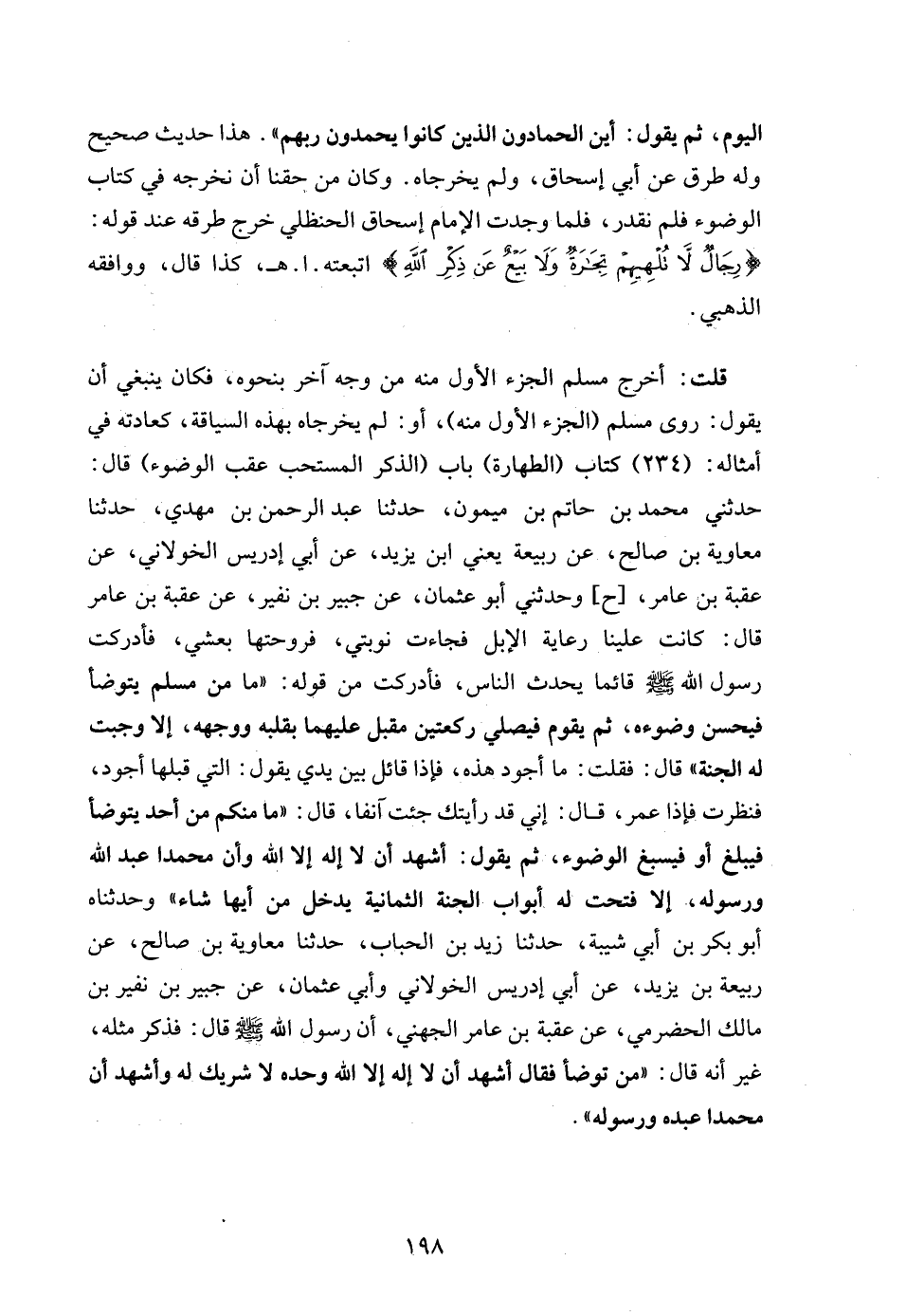 قلت: أخرج مسلم الجزء الأول منه من وجه آخر بنحوه، فكان ينبغي أن يقول: روى مسلم (الجزء الأول منه)، أو: لم يخرجاه بهذه السياقة، كعادته في أمثاله: (234) كتاب (الطهارة) باب (الذكر المستحب عقب الوضوء) قال: حدثني محمد بن حاتم بن ميمون، حدثنا عبد الرحمن بن مهدي، حدثنا معاوية بن صالح، عن ربيعة يعني ابن يزيد، عن أبي إدريس الخولاني، عن عقبة بن عامر، [ح] وحدثني أبو عثمان، عن جبير بن نفير، عن عقبة بن عامر قال: كانت علينا رعاية الإبل فجاءت نوبتي، فروحتها بعشي، فأدركت رسول الله - صلى الله عليه وسلم - قائما يحدث الناس، فأدركت من قوله: "ما من مسلم يتوضأ فيحسن وضوءه، ثم يقوم فيصلي ركعتين مقبل عليهما بقلبه ووجهه، إلا وجبت له الجنة" قال: فقلت: ما أجود هذه، فإذا قائل بين يدي يقول: التي قبلها أجود، فنظرت فإذا عمر، قال: إني قد رأيتك جئت آنفا، قال: "ما منكم من أحد يتوضأ فيبلغ أو فيسبغ الوضوء، ثم يقول: أشهد أن لا إله إلا الله وأن محمدا عبد الله ورسوله، إلا فتحت له أبواب الجنة الثمانية يدخل من أيها شاء" وحدثناه أبو بكر بن أبي شيبة، حدثنا زيد بن الحباب، حدثنا معاوية بن صالح، عن ربيعة بن يزيد، عن أبي إدريس الخولاني وأبي عثمان، عن جبير بن نفير بن مالك الحضرمي، عن عقبة بن عامر الجهني، أن رسول الله - صلى الله عليه وسلم - قال: فذكر مثله، غير أنه قال: "من توضأ فقال أشهد أن لا إله إلا الله وحده لا شريك له وأشهد أن محمدا عبده ورسوله".