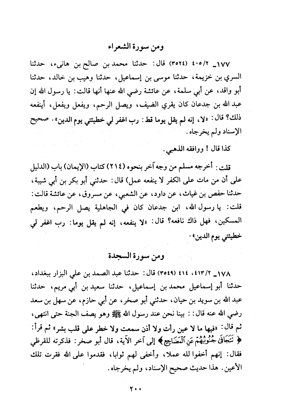 177 - 2/ 405 (3524) قال: حدثنا محمد بن صالح بن هانئ، حدثنا السري بن خزيمة، حدثنا موسى بن إسماعيل، حدثنا وهيب بن خالد، حدثنا أبو واقد، عن أبي سلمة، عن عائشة رضي الله عنها أنها قالت: يا رسول الله إن عبد الله بن جدعان كان يقري الضيف، ويصل الرحم، ويفعل ويفعل، أينفعه ذلك؟ قال: "لا، إنه لم يقل يوما قط: رب اكفر لي خطيئتي يوم الدين". صحيح الإسناد ولم يخرجاه.