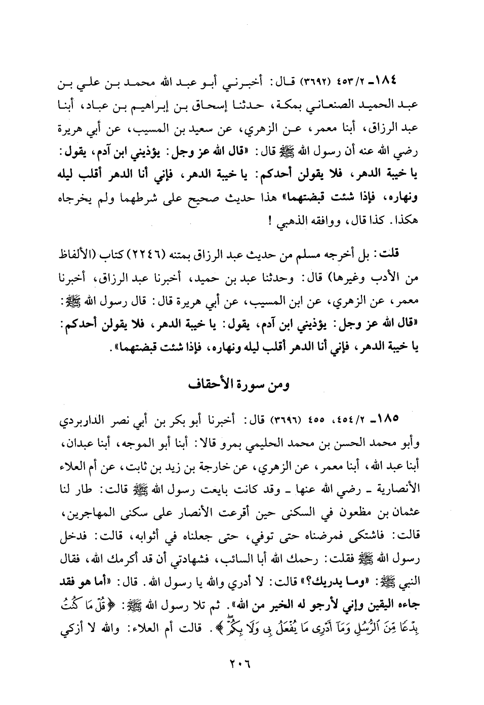 184 - 2/ 453 (3692) قال: أخبرني أبو عبد الله محمد بن علي بن عبد الحميد الصنعاني بمكة، حدثنا إسحاق بن إبراهيم بن عباد، أبنا عبد الرزاق، أبنا معمر، عن الزهري، عن سعيد بن المسيب، عن أبي هريرة رضي الله عنه أن رسول الله - صلى الله عليه وسلم - قال: "قال الله عز وجل: يؤذيني ابن آدم، يقول: يا خيبة الدهر، فلا يقولن أحدكم: يا خيبة الدهر، فإني أنا الدهر أقلب ليله ونهاره، فإذا شئت قبضتهما" هذا حديث صحيح على شرطهما ولم يخرجاه هكذا. كذا قال، ووافقه الذهبي!