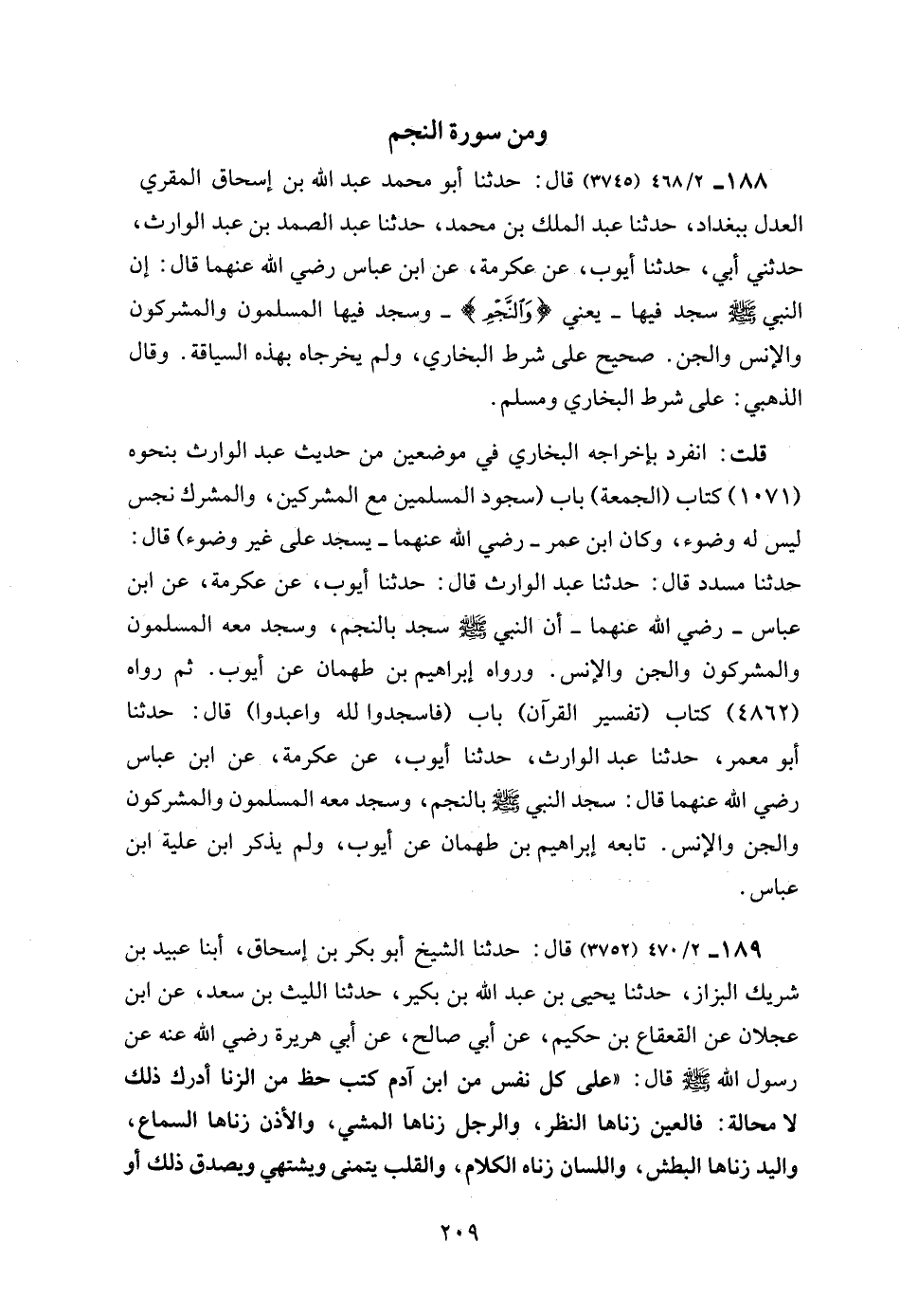 188 - 2/ 468 (3745) قال: حدثنا أبو محمد عبد الله بن إسحاق المقري العدل ببغداد، حدثنا عبد الملك بن محمد، حدثنا عبد الصمد بن عبد الوارث، حدثني أبي، حدثنا أيوب، عن. عكرمة، عن ابن عباس رضي الله عنهما قال: إن النبي - صلى الله عليه وسلم - سجد فيها - يعني {وَالنَّجْمِ} - وسجد فيها المسلمون والمشركون والإنس والجن. صحيح على شرط البخاري، ولم يخرجاه بهذه السياقة. وقال الذهبي: على شرط البخاري ومسلم.
