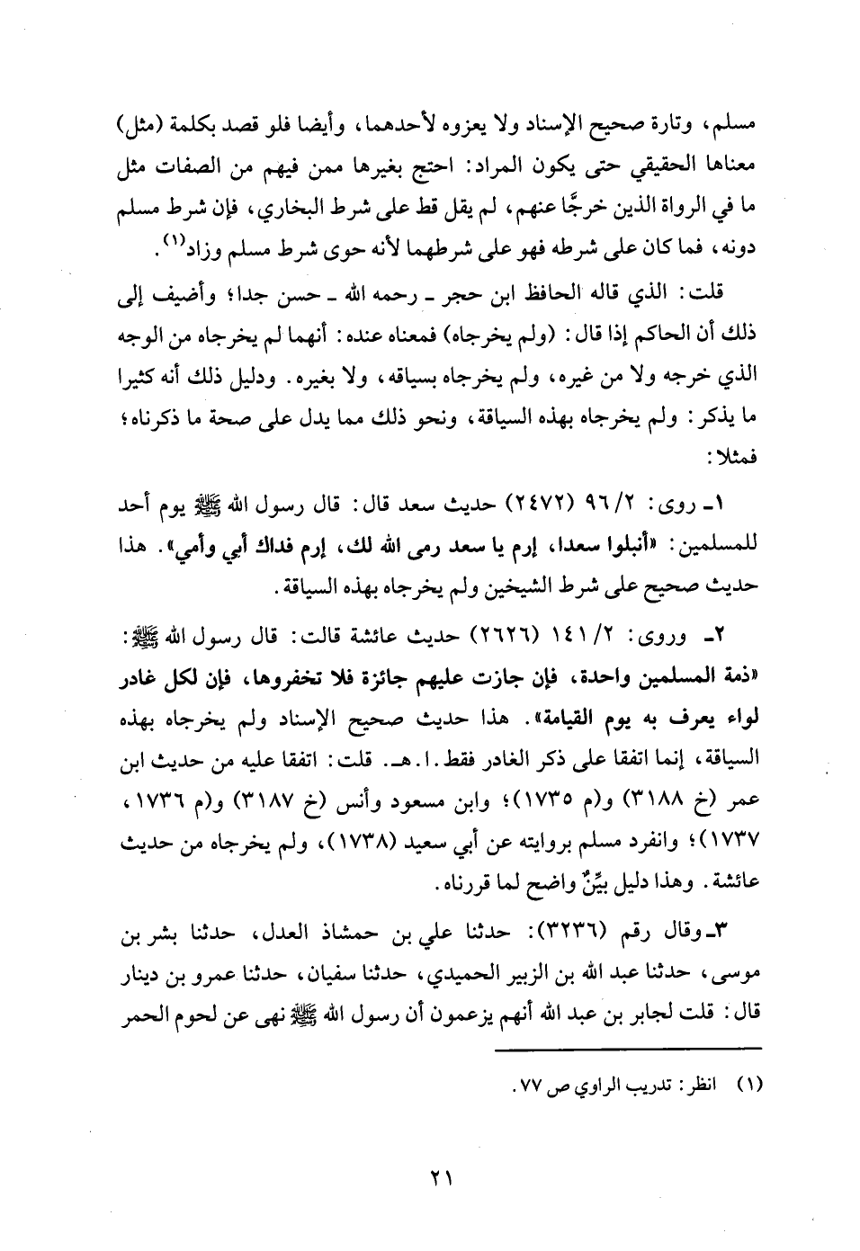 2 - وروى: 2/ 141 (2626) حديث عائشة قالت: قال رسول الله - صلى الله عليه وسلم -: "ذمة المسلمين واحدة، فإن جازت عليهم جائزة فلا تخفروها، فإن لكل غادر لواء يعرف به يوم القيامة". هذا حديث صحيح الإسناد ولم يخرجاه بهذه السياقة، إنما اتفقا على ذكر الغادر فقط. ا. هـ. قلت: اتفقا عليه من حديث ابن عمر (خ 3188) و (م 1735)؛ وابن مسعود وأنس (خ 3187) و (م 1736، 1737)؛ وانفرد مسلم بروايته عن أبي سعيد (1738)، ولم يخرجاه من حديث عائشة. وهذا دليل بيِّنٌ واضح لما قررناه.