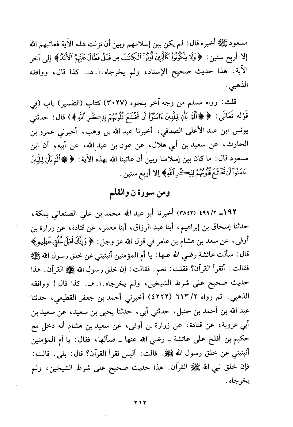 192 - 2/ 499 (3842) أخبرنا أبو عبد الله محمد بن علي الصنعاني بمكة، حدثنا إسحاق بن إبراهيم، أبنا عبد الرزاق، أبنا معمر، عن قتادة، عن زرارة بن أوفى، عن سعد بن هشام بن عامر في قول الله عز وجل: {وَإِنَّكَ لَعَلَى خُلُقٍ عَظِيمٍ} قال: سألت عائشة رضي الله عنها: يا أم المؤمنين أنبئيني عن خلق رسول الله - صلى الله عليه وسلم - فقالت: أتقرأ القرآن؟ فقلت: نعم. فقالت: إن خلق رسول الله - صلى الله عليه وسلم - القرآن. هذا حديث صحيح على شرط الشيخين، ولم يخرجاه. ا. هـ. كذا قال! ووافقه الذهبي. ثم رواه 2/ 613 (4222) أخبرني أحمد بن جعفر القطيعي، حدثنا عبد الله بن أحمد بن حنبل، حدثني أبي، حدثنا يحيى بن سعيد، عن سعيد بن أبي عروبة، عن قتادة، عن زرارة بن أوفى، عن سعيد بن هشام أنه دخل مع حكيم بن أفلح على عائشة - رضي الله عنها - فسألها، فقال: يا أم المؤمنين أنبئيني عن خلق رسول الله - صلى الله عليه وسلم -. قالت: أليس تقرأ القرآن؟ قال: بلى. قالت: فإن خلق نبي الله - صلى الله عليه وسلم - القرآن. هذا حديث صحيح على شرط الشيخين، ولم يخرجاه.