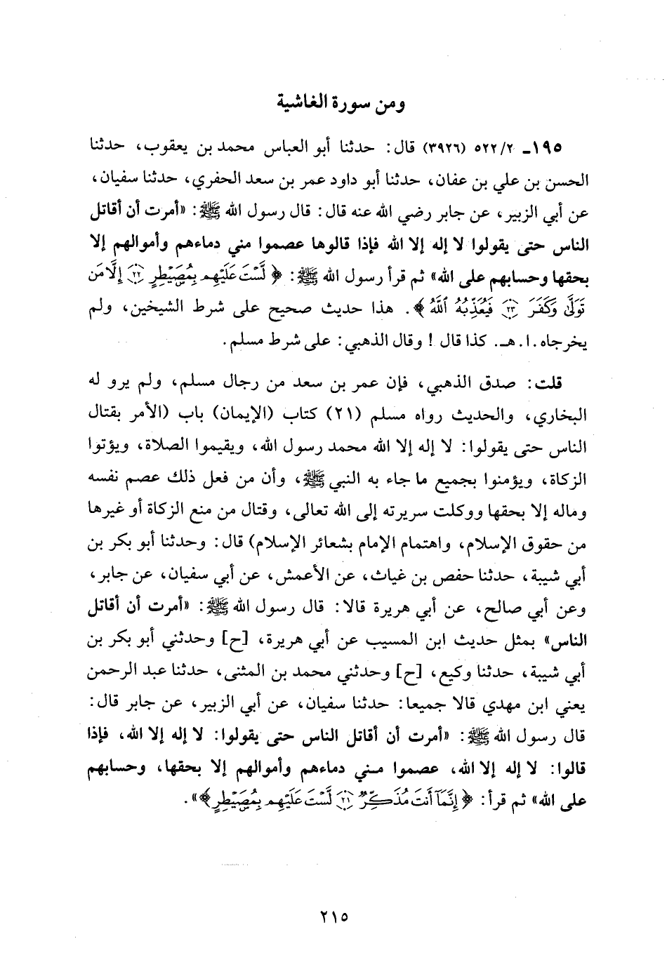 195 - 2/ 522 (3926) قال: حدثنا أبو العباس محمد بن يعقوب، حدثنا الحسن بن علي بن عفان، حدثنا أبو داود عمر بن سعد الحفري، حدثنا سفيان، عن أبي الزبير، عن جابر رضي الله عنه قال: قال رسول الله - صلى الله عليه وسلم -: "أمرت أن أقاتل الناس حتى يقولوا لا إله إلا الله فإذا قالوها عصموا مني دماءهم وأموالهم إلا بحقها وحسابهم على الله" ثم قرأ رسول الله - صلى الله عليه وسلم -: {لَسْتَ عَلَيْهِمْ بِمُصَيْطِرٍ (22) إِلَّا مَنْ تَوَلَّى وَكَفَرَ (23) فَيُعَذِّبُهُ اللَّهُ}. هذا حديث صحيح على شرط الشيخين، ولم يخرجاه. ا. هـ. كذا قال! وقال الذهبي: على شرط مسلم.
