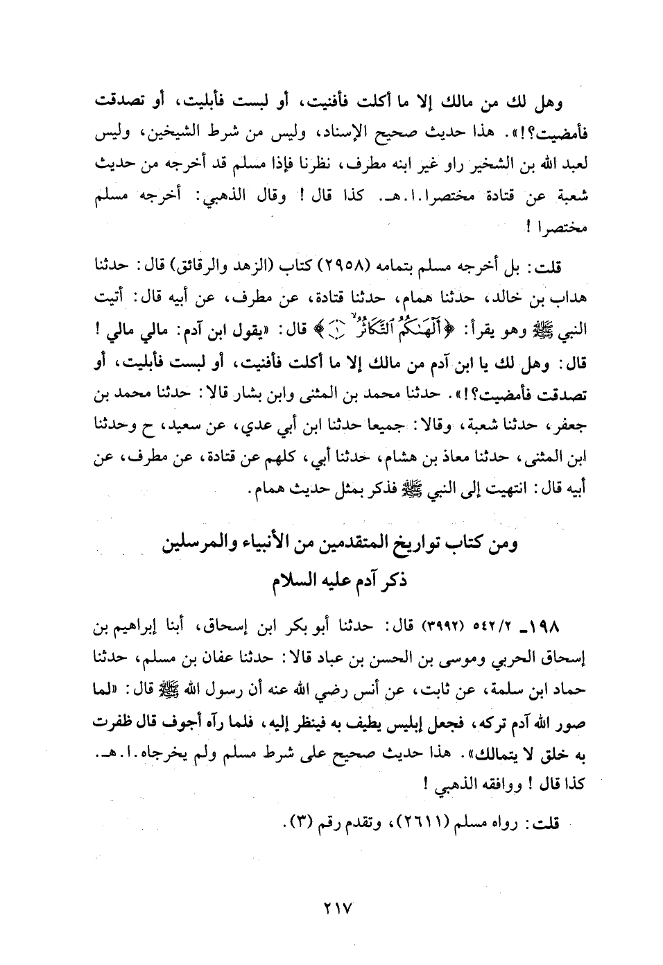 قلت: بل أخرجه مسلم بتمامه (2958) كتاب (الزهد والرقائق) قال: حدثنا هداب بن خالد، حدثنا همام، حدثنا قتادة، عن مطرف، عن أبيه قال: أتيت النبي - صلى الله عليه وسلم - وهو يقرأ: {أَلْهَاكُمُ التَّكَاثُرُ (1)} قال: "يقول ابن آدم: مالي مالي! قال: وهل لك يا ابن آدم من مالك إلا ما أكلت فافنيت، أو لبست فأبليت، أو تصدقت فأمضيت؟! ". حدثنا محمد بن المثنى وابن بشار قالا: حدثنا محمد بن جعفر، حدثنا شعبة، وقالا: جميعا حدثنا ابن أبي عدي، عن سعيد، ح وحدثنا ابن المثنى، حدثنا معاذ بن هشام، حدثنا أبي، كلهم عن قتادة، عن مطرف، عن أبيه قال: انتهيت إلى النبي - صلى الله عليه وسلم - فذكر بمثل حديث همام.