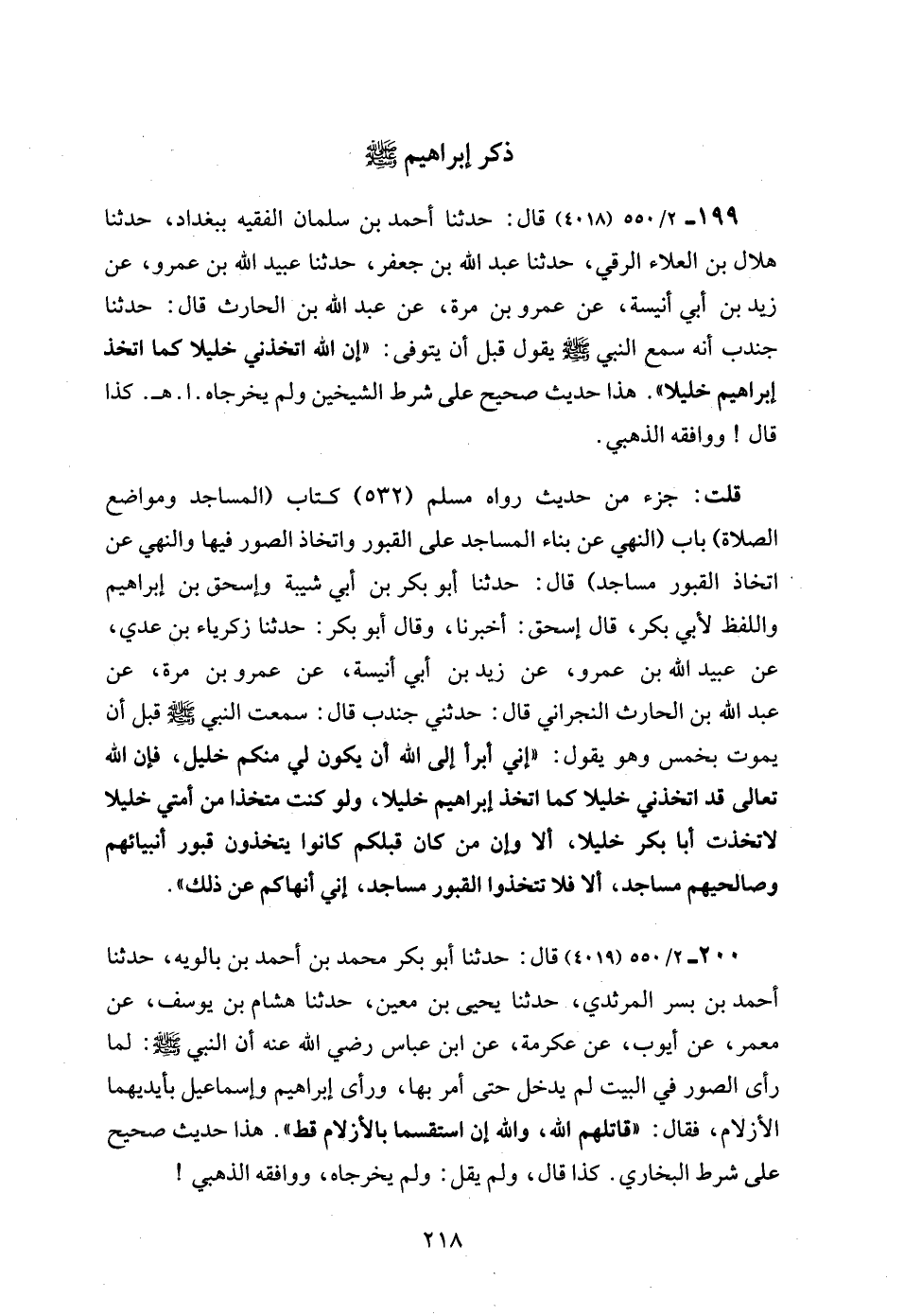 199 - 2/ 550 (4018) قال: حدثنا أحمد بن سلمان الفقيه ببغداد، حدثنا هلال بن العلاء الرقي، حدثنا عبد الله بن جعفر، حدثنا عبيد الله بن عمرو، عن زيد بن أبي أنيسة، عن عمرو بن مرة، عن عبد الله بن الحارث قال: حدثنا جندب أنه سمع النبي - صلى الله عليه وسلم - يقول قبل أن يتوفى: "إن الله اتخذني خليلا كما اتخذ إبراهيم خليلا". هذا حديث صحيح على شرط الشيخين ولم يخرجاه. ا. هـ. كذا قال! ووافقه الذهبي.