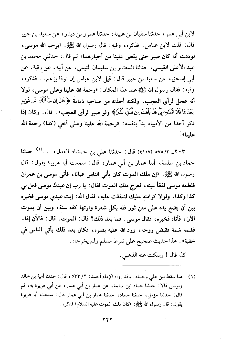 203 - 2/ 578 (4107) قال: حدثنا علي بن حمشاد العدل، ... (¬1) حدثنا حماد بن سلمة، أبنا عمار بن أبي عمار، قال: سمعت أبا هريرة يقول: قال رسول الله - صلى الله عليه وسلم -: "إن ملك الموت كان يأتي الناس عيانا، فأتى موسى بن عمران فلطمه موسى ففقأ عينه، فعرج ملك الموت فقال: يا رب إن عبدك موسى فعل بي كذا وكذا، ولولا كرامته عليك لشققت عليه، فقال الله: إيت عبدي موسى فخيره بين أن يضع يده على متن ثور فله بكل شعرة وارتها كفه سنة، وبين أن يموت الآن، فأتاه فخيره، فقال موسى: فما بعد ذلك؟ قال: الموت. قال: فالآن إذا، فشمه شمة فقبض روحه، ورد الله عليه بصره، فكان بعد ذلك يأتي الناس في خفية". هذا حديث صحيح على شرط مسلم ولم يخرجاه.