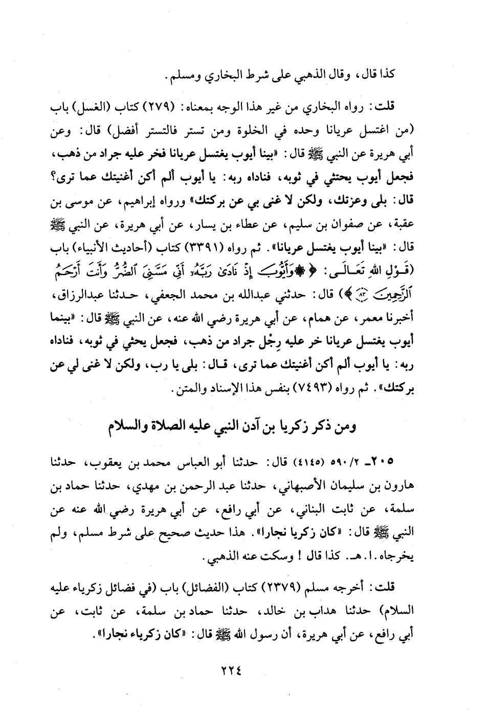 قلت: رواه البخاري من غير هذا الوجه بمعناه: (279) كتاب (الغسل) باب (من اغتسل عريانا وحده في الخلوة ومن تستر فالتستر أفضل) قال: وعن أبي هريرة عن النبي - صلى الله عليه وسلم - قال: "بينا أيوب يغتسل عريانا فخر عليه جراد من ذهب، فجعل أيوب يحتثي في ثوبه، فناداه ربه: يا أيوب ألم أكن أغنيتك عما ترى؟ قال: بلى وعزتك، ولكن لا غنى بي عن بركتك" ورواه إبراهيم، عن موسى بن عقبة، عن صفوان بن سليم، عن عطاء بن يسار، عن أبي هريرة، عن النبي - صلى الله عليه وسلم - قال: "بينا أيوب يغتسل عريانا". ثم رواه (3391) كتاب (أحاديث الأنبياء) باب (قَوْلِ اللَّهِ تَعَالَى: {وَأَيُّوبَ إِذْ نَادَى رَبَّهُ أَنِّي مَسَّنِيَ الضُّرُّ وَأَنْتَ أَرْحَمُ الرَّاحِمِينَ (83)}) قال: حدثني عبد الله بن محمد الجعفي، حدثنا عبد الرزاق، أخبرنا معمر، عن همام، عن أبي هريرة رضي الله عنه، عن النبي - صلى الله عليه وسلم - قال: "بينما أيوب يغتسل عريانا خر عليه رِجْل جراد من ذهب، فجعل يحثي في ثوبه، فناداه ربه: يا أيوب ألم أكن أغنيتك عما ترى، قال: بلى يا رب، ولكن لا غنى لي عن بركتك". ثم رواه (7493) بنفس هذا الإسناد والمتن.