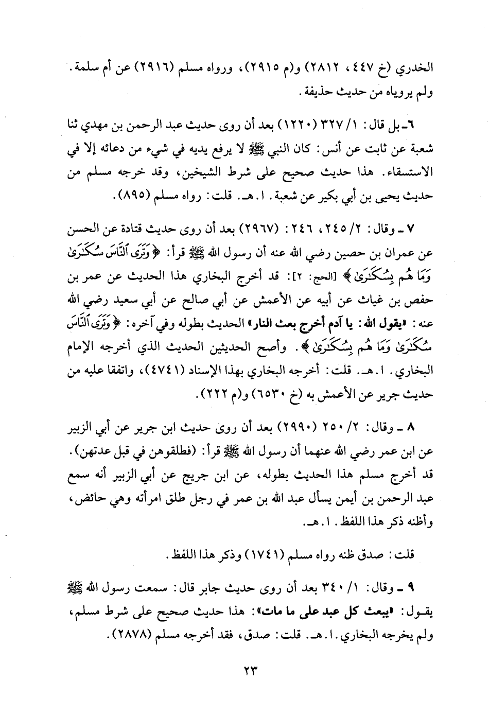 9 - وقال: 1/ 340 بعد أن روى حديث جابر قال: سمعت رسول الله - صلى الله عليه وسلم - يقول: "يبعث كل عبد على ما مات": هذا حديث صحيح على شرط مسلم، ولم يخرجه البخاري. ا. هـ. قلت: صدق، فقد أخرجه مسلم (2878).