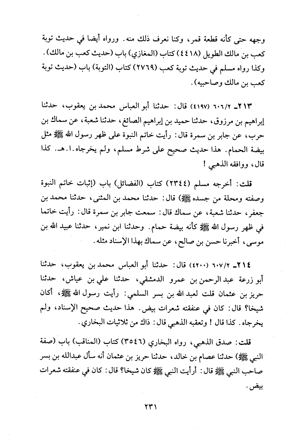 213 - 2/ 606 (4197) قال: حدثنا أبو العباس محمد بن يعقوب، حدثنا إبراهيم بن مرزوق، حدثنا حميد بن إبراهيم الصائغ، حدثنا شعبة، عن سماك بن حرب، عن جابر بن سمرة قال: رأيت خاتم النبوة على ظهر رسول الله - صلى الله عليه وسلم - مثل بيضة الحمام. هذا حديث صحيح على شرط مسلم، ولم يخرجاه. ا. هـ. كذا قال، ووافقه الذهبي!