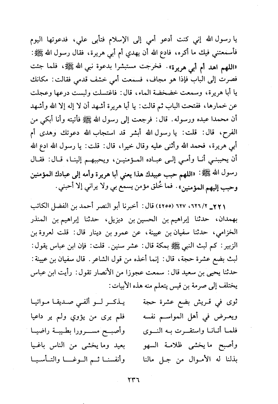 221 - 2/ 626، 627 (4255) قال: أخبرنا أبو النصر أحمد بن الفضل الكاتب بهمدان، حدثنا إبراهيم بن الحسين بن ديزيل، حدثنا إبراهيم بن المنذر الخزامي، حدثنا سفيان بن عيينة، عن عمرو بن دينار قال: قلت لعروة بن الزبير: كم لبث النبي - صلى الله عليه وسلم - بمكة قال: عشر سنين. قلت: فإن ابن عباس يقول: لبث بضع عشرة حجة، قال: إنما أخذه من قول الشاعر. قال سفيان بن عيينة: حدثنا يحيى بن سعيد قال: سمعت عجوزا من الأنصار تقول: رأيت ابن عباس يختلف إلى صرمة بن قيس يتعلم منه هذه الأبيات: