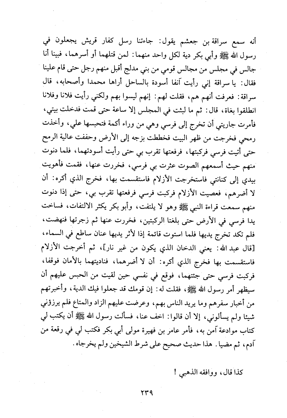 أنه سمع سراقة بن جعشم يقول: جاءتنا رسل كفار قريش يجعلون في رسول الله - صلى الله عليه وسلم - وأبي بكر دية لكل واحد منهما: لمن قتلهما أو أسرهما، فبينا أنا جالس في مجلس من مجالس قومي من بني مدلج أقبل منهم رجل حتى قام علينا فقال: يا سراقة إني رأيت آنفا أسودة بالساحل أراها محمدا وأصحابه، قال سراقة: فعرفت أنهم هم، فقلت لهم: إنهم ليسوا بهم ولكني رأيت فلانا وفلانا انطلقوا بغاة، قال: ثم ما لبثت في المجلس إلا ساعة حتى قمت فدخلت بيتي، فأمرت جاريتي أن تخرج إلى فرسي وهي من وراء أكمة فتحبسها علي، وأخذت رمحي فخرجت من ظهر البيت فخططت بزجه إلى الأرض وحففت عالية الرمح حتى أتيت فرسي فركبتها، فرفعتها تقرب بي حتى رأيت أسودتهما، فلما دنوت منهم حيث أسمعهم الصوت عثرت بي فرسي، فخررت عنها، فقمت فأهويت بيدي إلى كنانتي فاستخرجت الأزلام فاستقسمت بها، فخرج الذي أكره: أن لا أضرهم، فعصيت الأزلام فركبت فرسي فرفعتها تقرب بي، حتى إذا دنوت منهم سمعت قراءة النبي - صلى الله عليه وسلم - وهو لا يلتفت، وأبو بكر يكثر الالتفات، فساخت يدا فرسي في الأرض حتى بلغتا الركبتين، فخررت عنها ثم زجرتها فنهضت، فلم تكد تخرج يديها فلما استوت قائمة إذا لأثر يديها عنان ساطع في السماء، [قال عبد الله: يعني الدخان الذي يكون من غير نار]، ثم أخرجت الأزلام فاستقسمت بها فخرج الذي أكره: أن لا أضرهما، فناديتهما بالأمان فوقفا، فركبت فرسي حتى جئتهما، فوقع في نفسي حين لقيت من الحبس عليهم أن سيظهر أمر رسول الله - صلى الله عليه وسلم -، فقلت له: إن قومك قد جعلوا فيك الدية، وأخبرتهم من أخبار سفرهم وما يريد الناس بهم، وعرضت عليهم الزاد والمتاع فلم يرزؤني شيئا ولم يسألوني، إلا أن قالوا: اخف عنا، فسألت رسول الله - صلى الله عليه وسلم - أن يكتب لي كتاب موادعة آمن به، فأمر عامر بن فهيرة مولى أبي بكر فكتب لي في رقعة من آدم، ثم مضيا. هذا حديث صحيح على شرط الشيخين ولم يخرجاه.