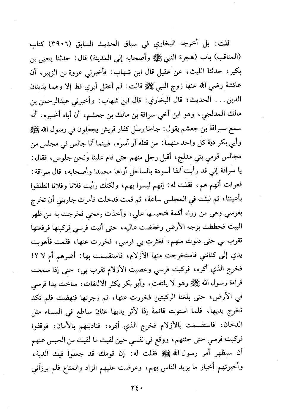 قلت: بل أخرجه البخاري في سياق الحديث السابق (3906) كتاب (المناقب) باب (هجرة النبي - صلى الله عليه وسلم - وأصحابه إلى المدينة) قال: حدثنا يحيى بن بكير، حدثنا الليث، عن عقيل قال ابن شهاب: فأخبرني عروة بن الزبير، أن عائشة رضي الله عنها زوج النبي - صلى الله عليه وسلم - قالت: لم أعقل أبوي قط إلا وهما يدينان الدين ... الحديث؛ قال البخاري: قال ابن شهاب: وأخبرني عبد الرحمن بن مالك المدلجي، وهو ابن أخي سراقة بن مالك بن جعشم، أن أباه أخبره، أنه سمع سراقة بن جعشم يقول: جاءنا رسل كفار قريش يجعلون في رسول الله - صلى الله عليه وسلم - وأبي بكر دية كل واحد منهما: من قتله أو أسره، فبينما أنا جالس في مجلس من مجالس قومي بني مدلج، أقبل رجل منهم حتى قام علينا ونحن جلوس، فقال: يا سراقة إني قد رأيت آنفا أسودة بالساحل أراها محمدا وأصحابه، قال سراقة: فعرفت أنهم هم، فقلت له: إنهم ليسوا بهم، ولكنك رأيت فلانا وفلانا انطلقوا بأعيننا، ثم لبثت في المجلس ساعة، ثم قمت فدخلت فأمرت جاريتي أن تخرج بفرسي وهي من وراء أكمة فتحبسها علي، وأخذت رمحي فخرجت به من ظهر البيت فحططت بزجه الأرض وخفضت عاليه، حتى أتيت فرسي فركبتها فرفعتها تقرب بي حتى دنوت منهم، فعثرت بي فرسي، فخررت عنها، فقمت فأهويت يدي إلى كنانتي فاستخرجت منها الأزلام، فاستقسمت بها: أضرهم أم لا؟! فخرج الذي أكره، فركبت فرسي وعصيت الأزلام تقرب بي، حتى إذا سمعت قراءة رسول الله - صلى الله عليه وسلم - وهو لا يلتفت، وأبو بكر يكثر الالتفات، ساخت يدا فرسي في الأرض، حتى بلغتا الركبتين فخررت عنها، ثم زجرتها فنهضت فلم تكد تخرج يديها، فلما استوت قائمة إذا لأثر يديها عثان ساطع في السماء مثل الدخان، فاستقسمت بالأزلام فخرج الذي أكره، فناديتهم بالأمان، فوقفوا فركبت فرسي حتى جئتهم، ووقع في نفسي حين لقيت ما لقيت من الحبس عنهم أن سيظهر أمر رسول الله - صلى الله عليه وسلم - فقلت له: إن قومك قد جعلوا فيك الدية، وأخبرتهم أخبار ما يريد الناس بهم، وعرضت عليهم الزاد والمتاع فلم يرزآني