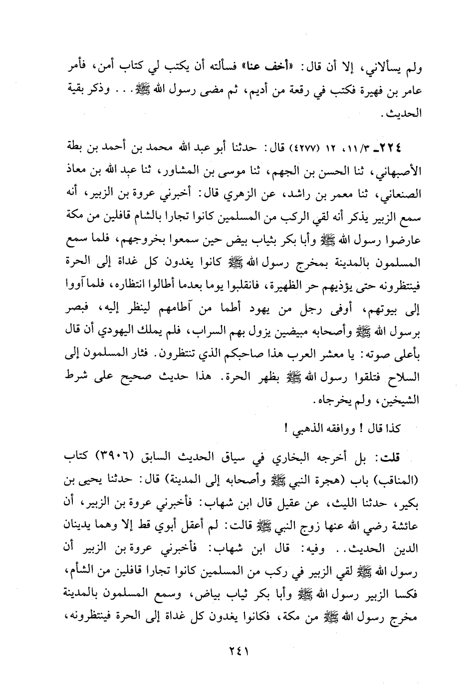 224 - 3/ 11، 12 (4277) قال: حدثنا أبو عبد الله محمد بن أحمد بن بطة الأصبهاني، ثنا الحسن بن الجهم، ثنا موسى بن المشاور، ثنا عبد الله بن معاذ الصنعاني، ثنا معمر بن راشد، عن الزهري قال: أخبرني عروة بن الزبير، أنه سمع الزبير يذكر أنه لقي الركب من المسلمين كانوا تجارا بالشام قافلين من مكة عارضوا رسول الله - صلى الله عليه وسلم - وأبا بكر بثياب بيض حين سمعوا بخروجهم، فلما سمع المسلمون بالمدينة بمخرج رسول الله - صلى الله عليه وسلم - كانوا يغدون كل غداة إلى الحرة فينتظرونه حتى يؤذيهم حر الظهيرة، فانقلبوا يوما بعدما أطالوا انتظاره، فلما آووا إلى بيوتهم، أوفى رجل من يهود أطما من آطامهم لينظر إليه، فبصر برسول الله - صلى الله عليه وسلم - وأصحابه مبيضين يزول بهم السراب، فلم يملك اليهودي أن قال بأعلى صوته: يا معشر العرب هذا صاحبكم الذي تنتظرون. فثار المسلمون إلى السلاح فتلقوا رسول الله - صلى الله عليه وسلم - بظهر الحرة. هذا حديث صحيح على شرط الشيخين، ولم يخرجاه.