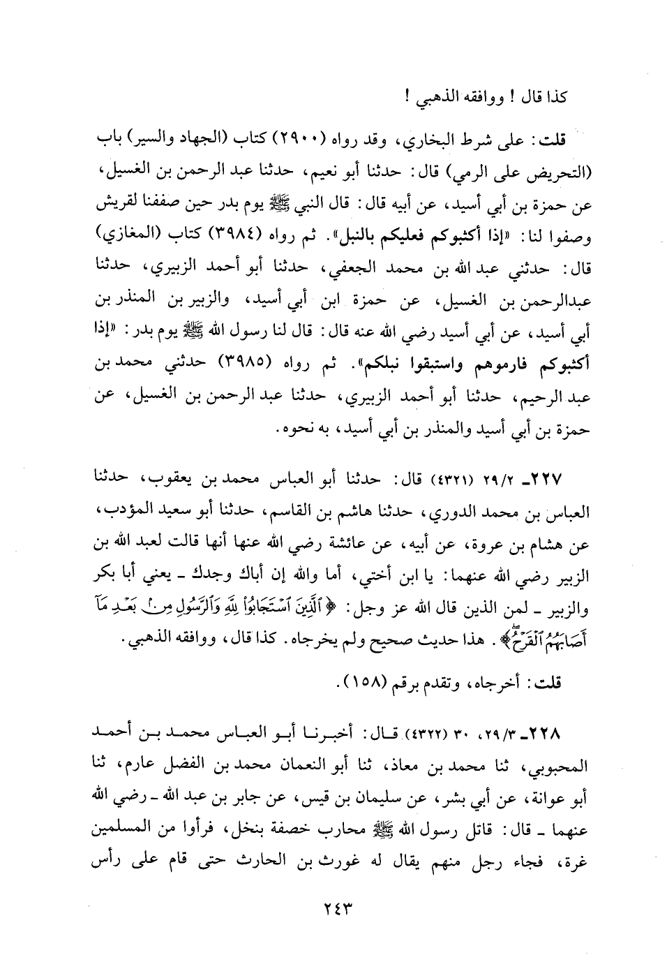 227 - 2/ 29 (4321) قال: حدثنا أبو العباس محمد بن يعقوب، حدثنا العباس بن محمد الدوري، حدثنا هاشم بن القاسم، حدثنا أبو سعيد المؤدب، عن هشام بن عروة، عن أبيه، عن عائشة رضي الله عنها أنها قالت لعبد الله بن الزبير رضي الله عنهما: يا ابن أختي، أما والله إن أباك وجدك - يعني أبا بكر والزبير - لمن الذين قال الله عز وجل: {الَّذِينَ اسْتَجَابُوا لِلَّهِ وَالرَّسُولِ مِنْ بَعْدِ مَا أَصَابَهُمُ الْقَرْحُ}. هذا حديث صحيح ولم يخرجاه. كذا قال، ووافقه الذهبي.